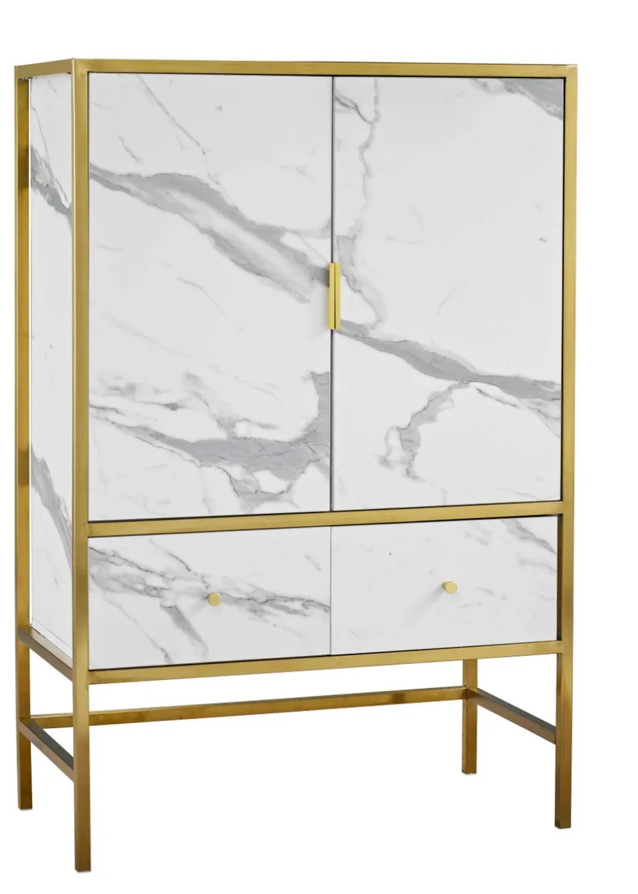 The Monaco wine cocktail cabinet will be the new piece de resistance of your living space! Add that wow factor when entertaining guests, or just yourselves, with this luxurious cabinet that will house all your entertaining needs. Removable shelves to accommodate your storage requirements. Available in white or black faux marble with a sleek gold frame, this piece is an easy, glamourous, yet affordable update for your home. Please note this is not suitable for home delivery, must be delivered to store/branch or available for collection. (1200x400x800)