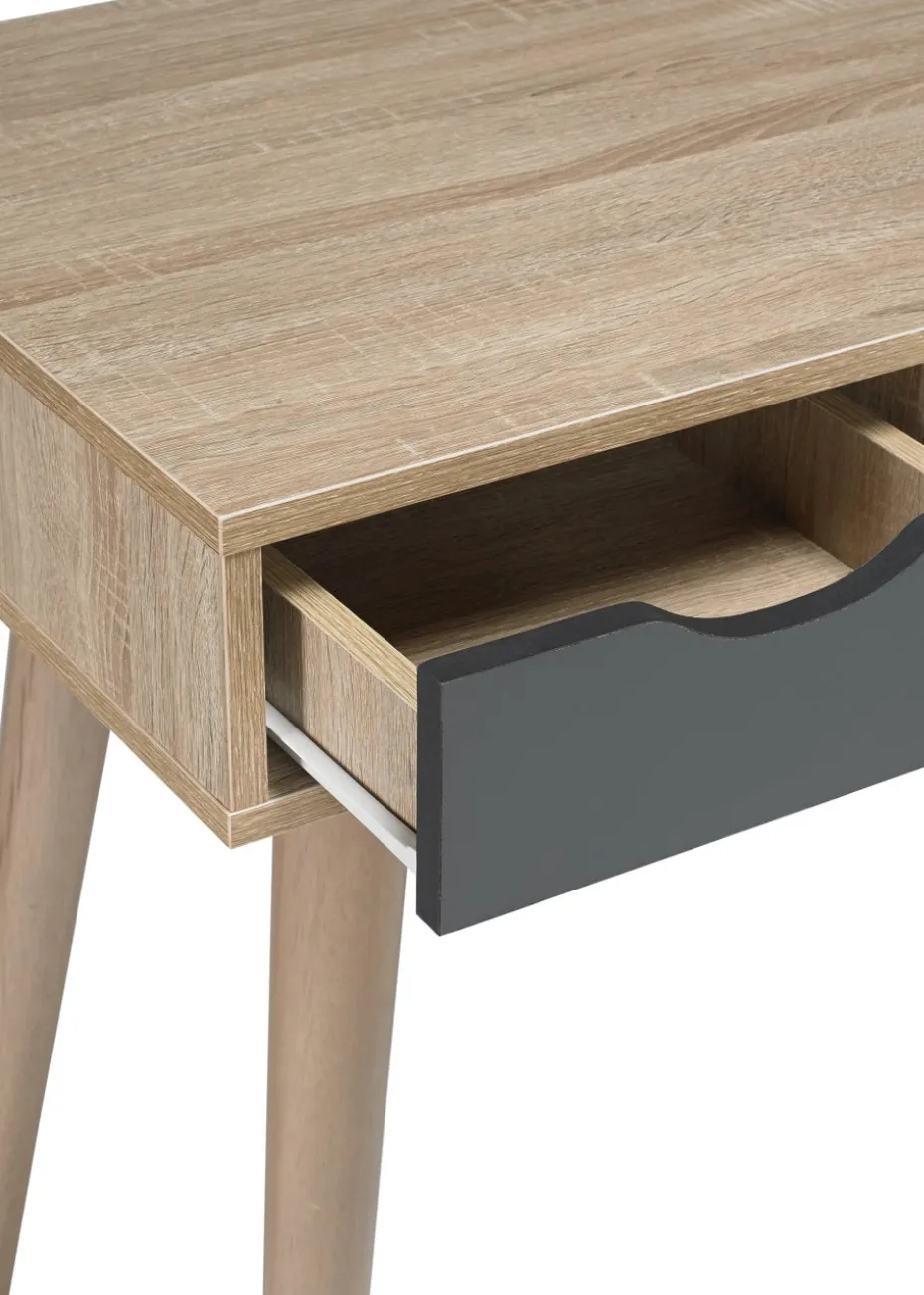 Completing an affordable, retro range of furniture, the Scandi Oak Desk features angled legs and a large table surface inlaid with 2 drawers for storage. Finished in oak, with accent white and grey drawers, this design is ideal for those looking for unique style, practical storage options and something a bit more adventurous from living area. (786x500x1100)
