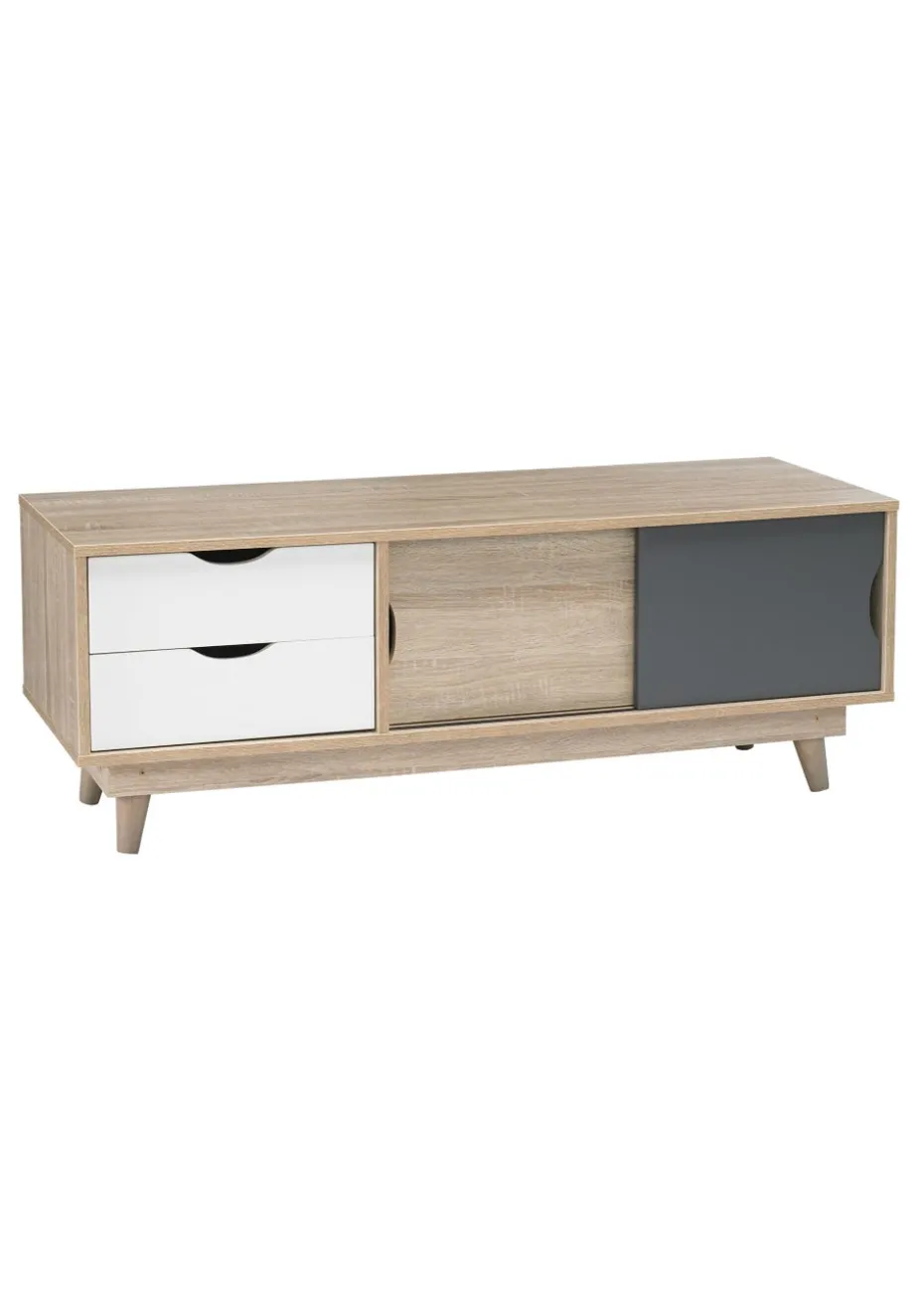 Completing an affordable, retro range of furniture, the Scandi Oak TV Unit features angled legs and a large table surface inlaid with 2 cupboards and 2 drawer combination for storage. Finished in oak, with accent white drawers and grey door, this design is ideal for those looking for unique style, practical storage options and something a bit more adventurous from living area. (480x450x1200)