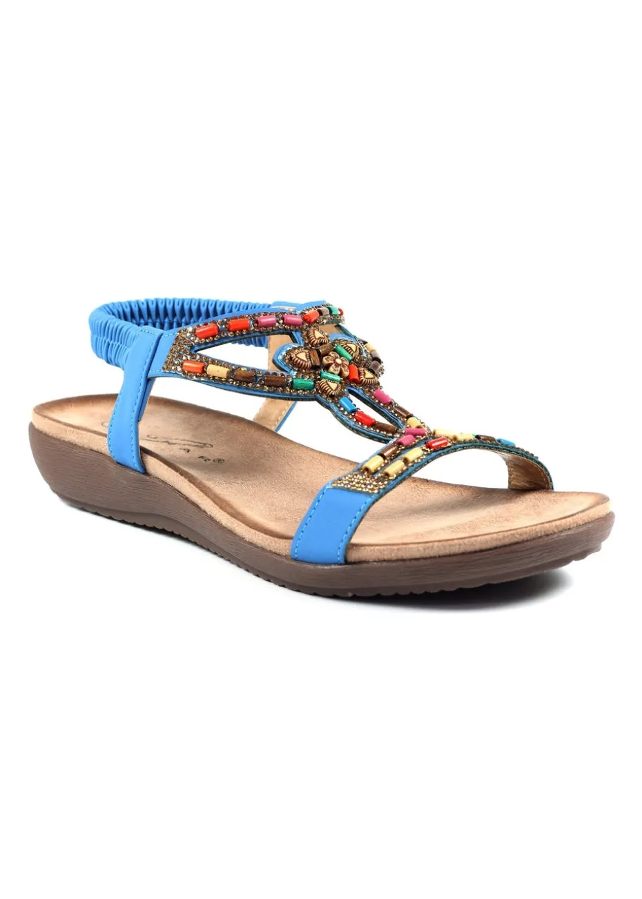 Make a colourful statement in the Mariella blue sandal. Embellished with colourful beads and diamante details, this glitzy sandal is the perfect summer accessory. Featuring a padded insole and elasticated ankle strap, you are guaranteed a secure and comfortable fit all day.