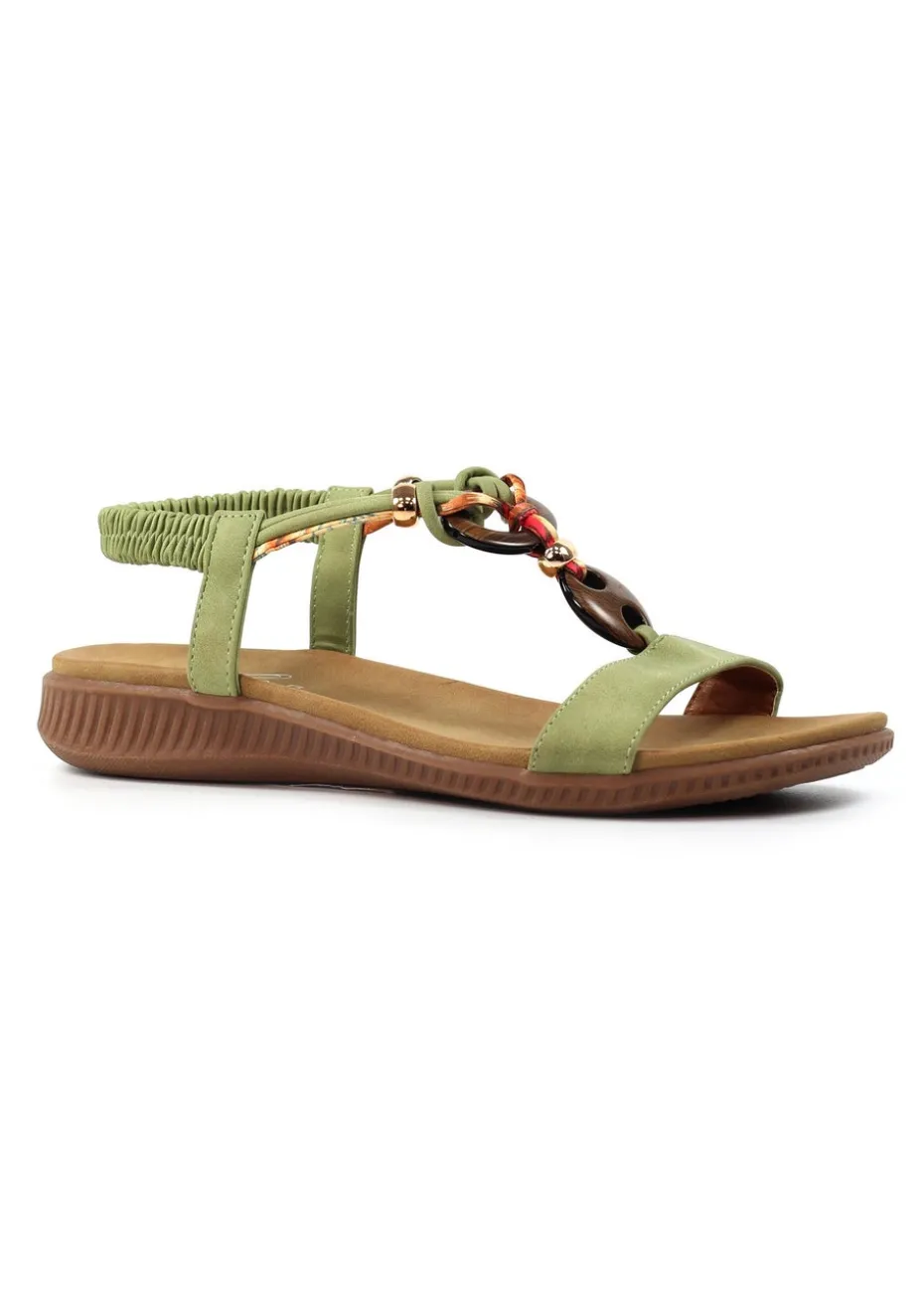 Upgrade your style with the chic Brava sandal in khaki. Crafted with a padded insole for maximum comfort, these sandals feature an elasticated ankle strap for the perfect fit. Finished with woven straps and wooden beads for an added touch of boho flair. Stride confidently in the Bora.