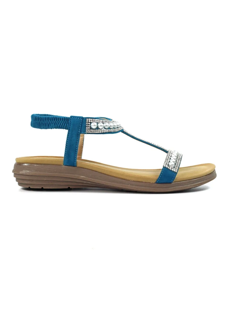 Step into luxury with the Tancy teal sandal, where elegance and comfort combine. The padded insole ensures a comfortable stride throughout the day, while the elasticated ankle strap provides an easy and secure fit. The upper straps are adorned with diamantes and pearls, adding a touch of glamour to your look.