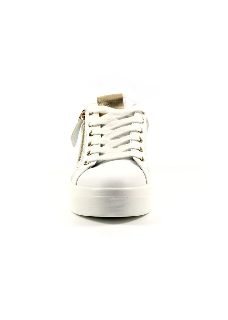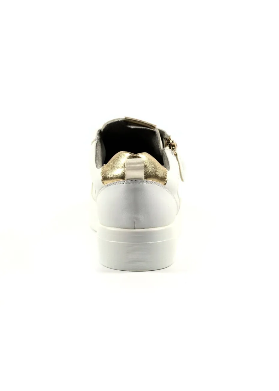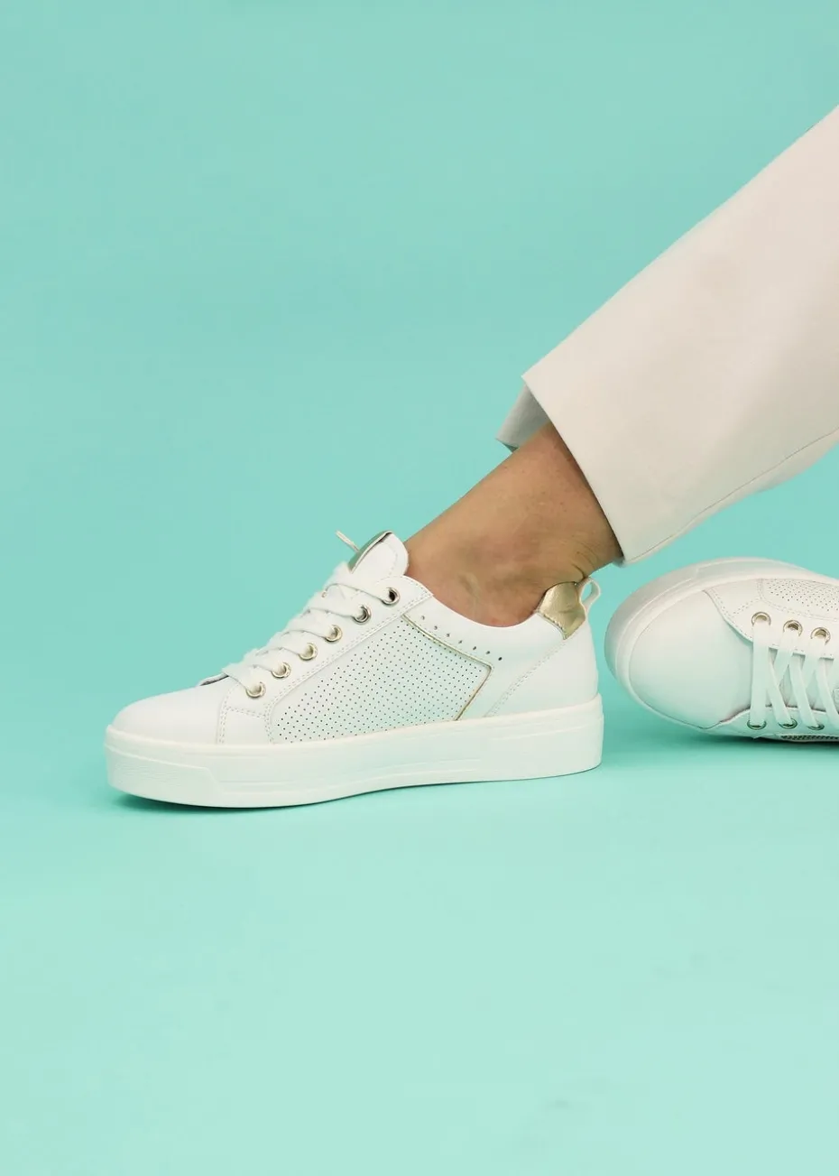 Elevate your style with the Nia trainer in white. This clean silhouette offers a modern look while the padded insole ensures exceptional comfort throughout the day. Featuring subtle hints of metallic gold, this trainer will add a contemporary edge to your ensemble.