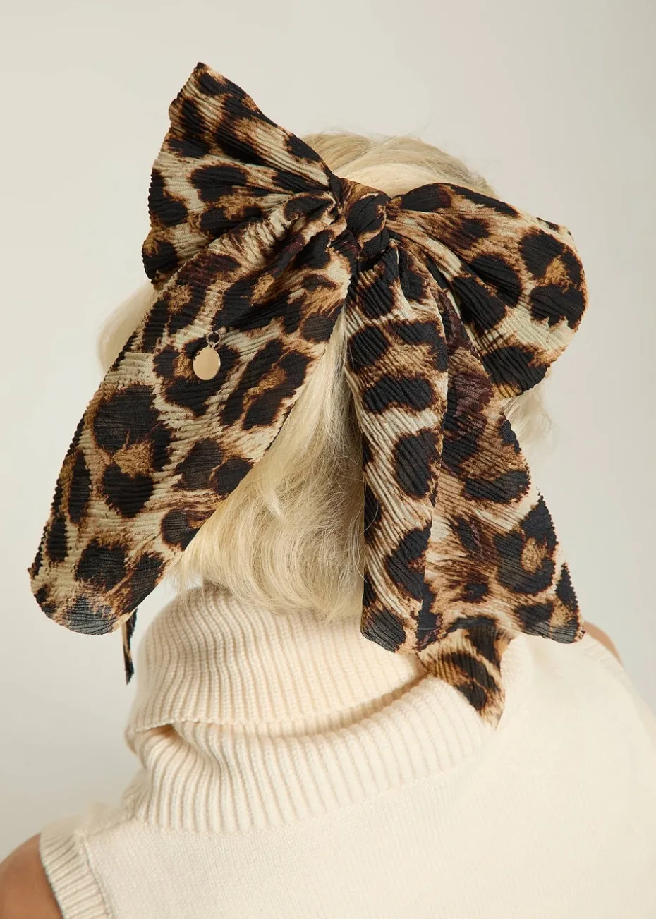 Our Halle Leopard print bow is this seasons must have add on, featuring a soft satin finish and gold hardware.