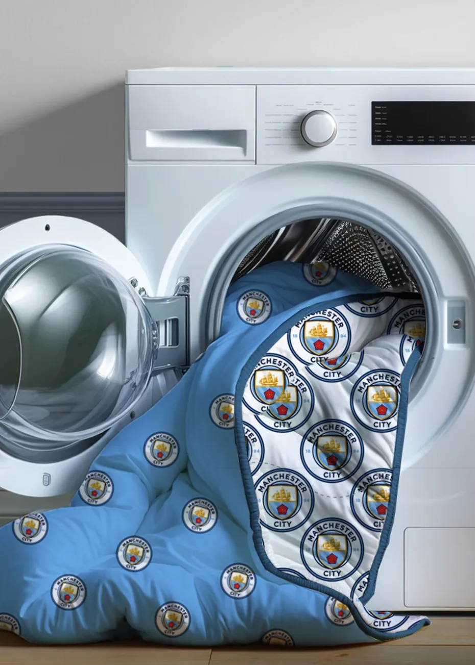 Transform your bedroom with the Manchester City Coverless Bedding Set, a revolution in bedding that combines style, convenience, and your passion for the club. This isn’t your ordinary duvet set; it’s a reimagined way to experience comfort. Gone are the days of struggling with duvet covers. The coverless design is carefree and hassle-free, making it perfect for those movie nights on the couch, spontaneous sleepovers, or cosy staycations. Simply roll and “”squish”” it into the handy carry bag, and you’re ready to go. Crafted with the highest quality materials, this duvet set features a soft-touch microfibre cover and a lightweight fibre fill, ensuring you experience the utmost comfort wherever you use it. Plus, it’s eco-friendly – the quilt is filled with 100% recycled polyester made from PET bottles, making it better for you and the environment. The Manchester City Coverless Duvet Set includes a reversible quilt and a matching pillowcase, both displaying the iconic club crest and the famous City blue. It’s a statement piece that resonates with every true Cityzens fan. Whether you’re celebrating victories, relaxing on lazy weekends, or simply showcasing your love for the club, this coverless duvet set is the ultimate choice. Make your home a true Cityzens haven with the Manchester City Coverless Duvet Set, and show your pride and loyalty in style.