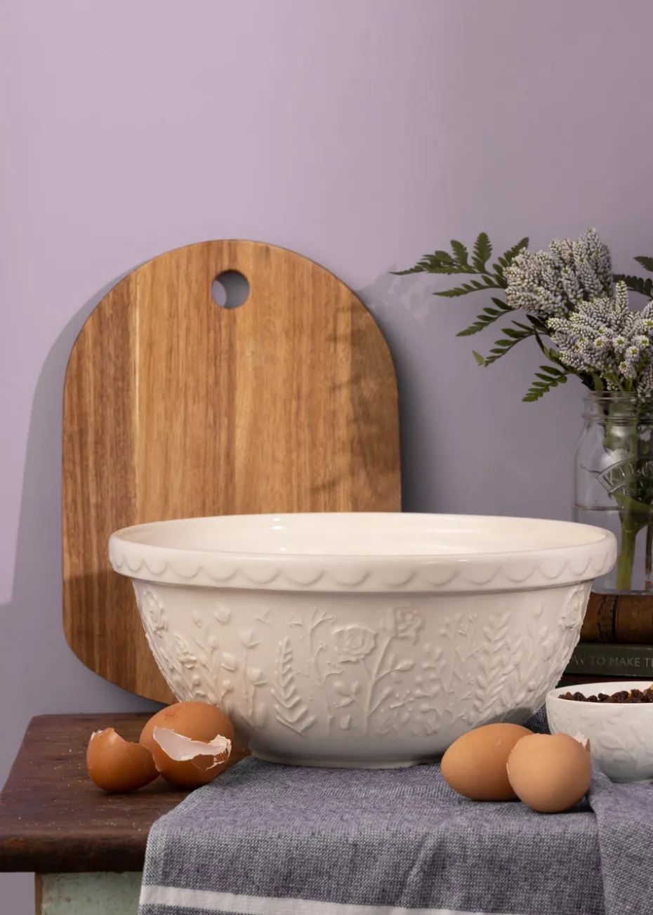 The Mason Cash In the Meadow collection is intricately embossed with delicate florals and foliage, with a beautiful colour palette. A perfect addition to any kitchen. Made from earthenware, the mixing bowl is light enough to hold in one arm while mixing, but sturdy enough when using on the counter top, making it the perfect bowl for home or professional bakers. The distinct patterned exterior and rim is designed to help bakers grip and tip the bowl, while the wide shallow shape allows for kneading within the bowl. The Size 12 Mixing bowl measures 29cm x 14cm, with a capacity of 4 litres, making this a perfect size for dough, pastry, cake or cookie mixes. The bowl is dishwasher and freezer safe. The mixing bowls have been a classic for Mason Cash for centuries, with a high-gloss glaze providing a chip resistant finish. Mason Cash offer mixing bowls in a wide variety of sizes and colours, providing options for every baker and to suit all kitchens. Mason Cash was established in the heart of the English ceramic industry back in 1800 and has become world renowned for its innovative, classic kitchenware today.