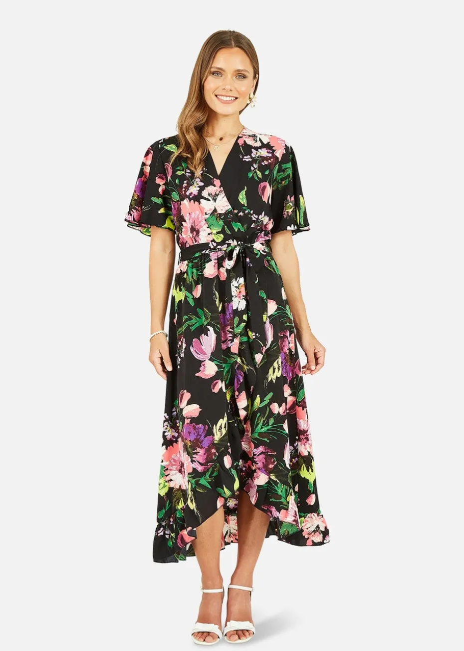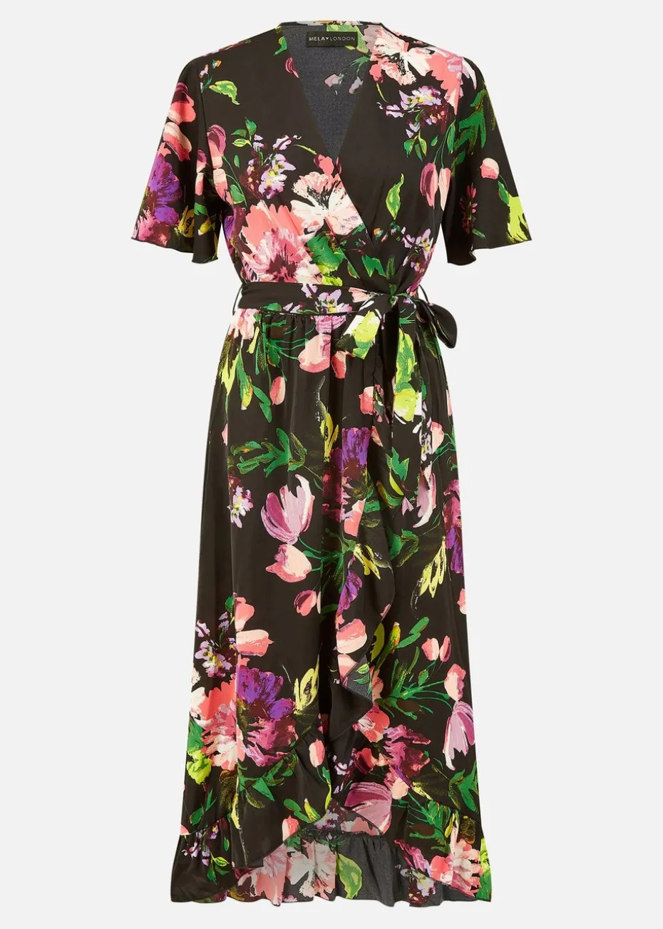 Be the first to review “Mela Black Floral Wrap Midi Dress With Frills” Cancel reply