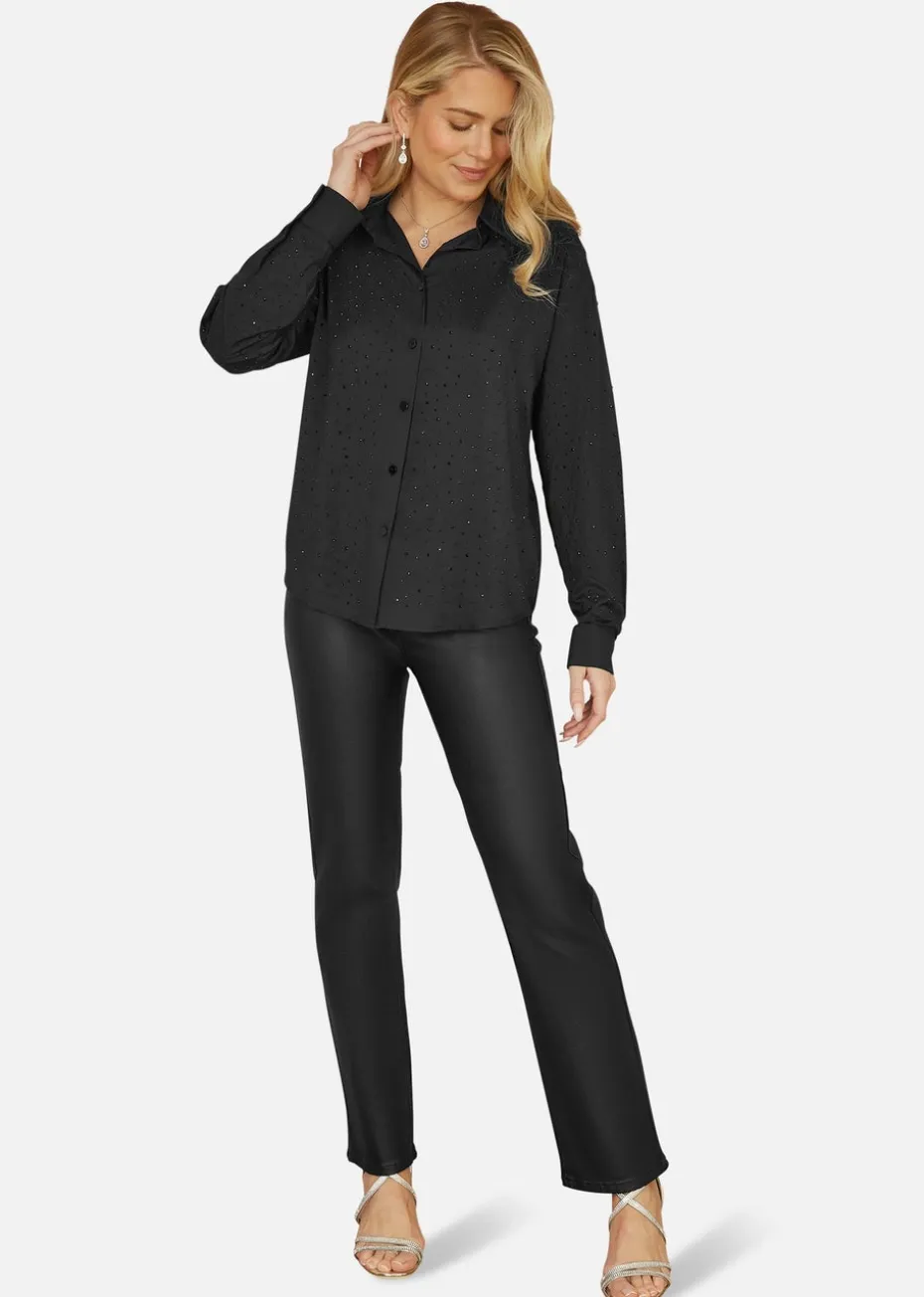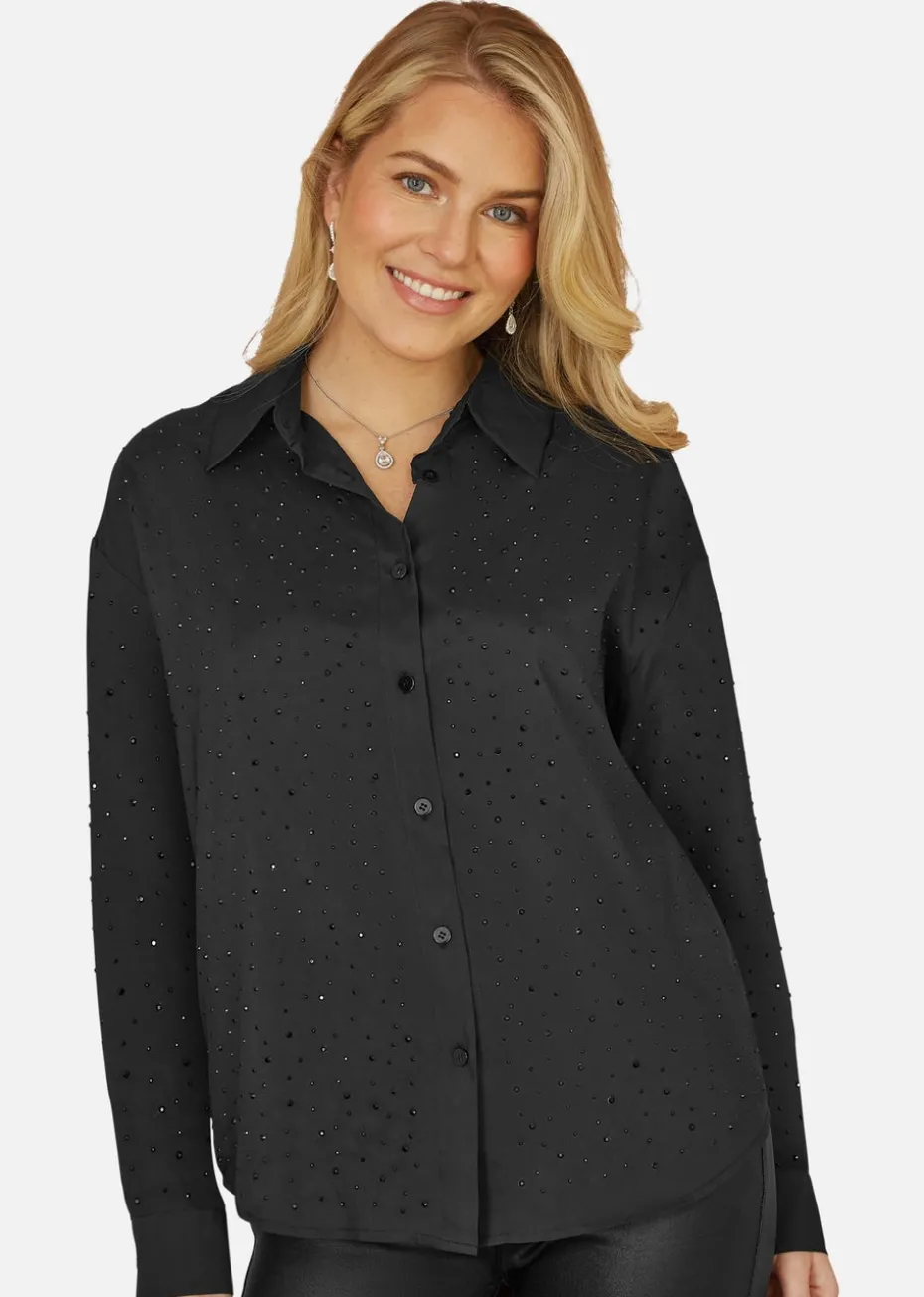 The perfect party season staple, sparkle and shine at any invite. Cut in a flattering shirt style, with all over gemstones that catch the light beautifully. We love this styled simply with jeans or amp up the party feeling with a faux leather skirt.