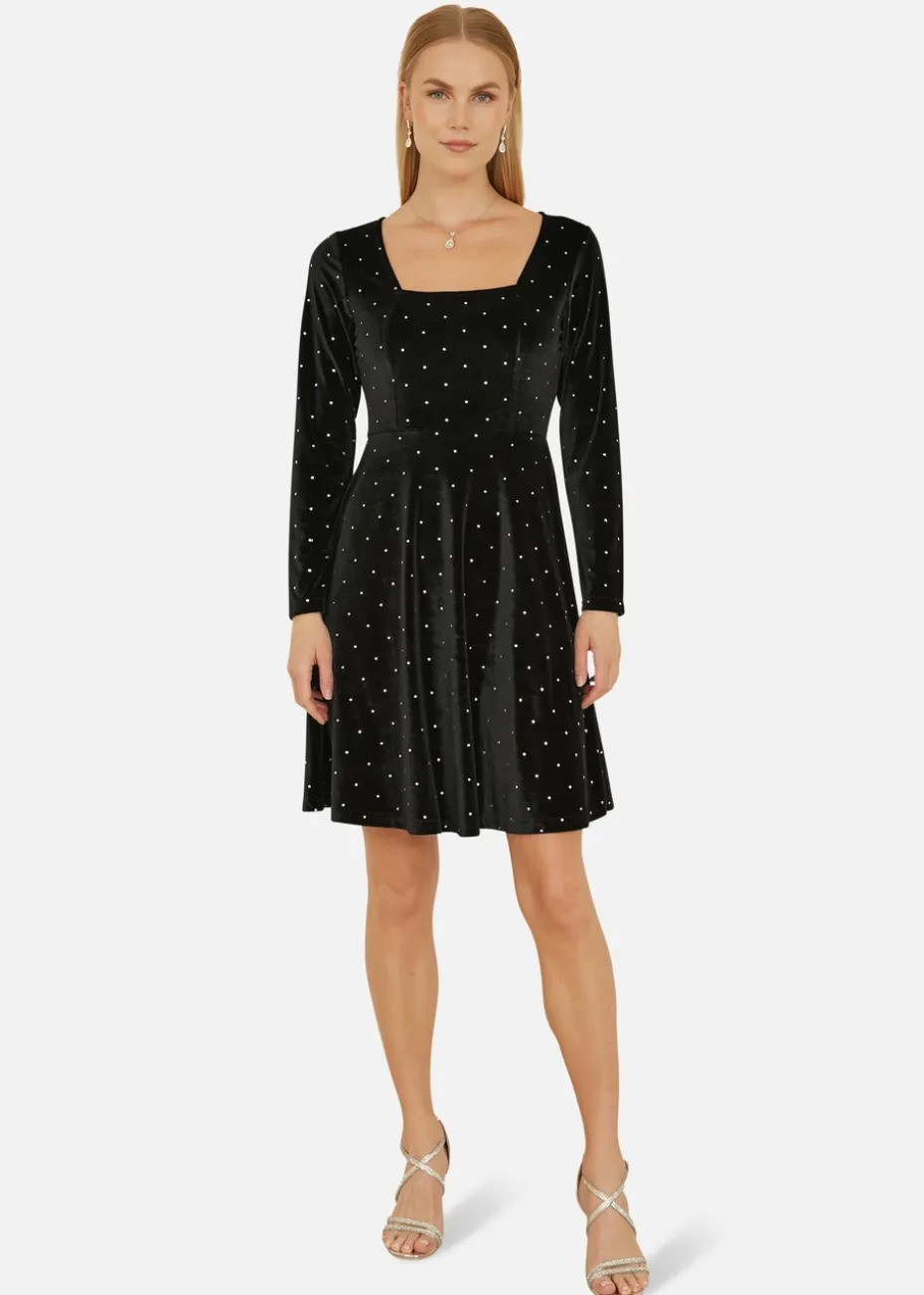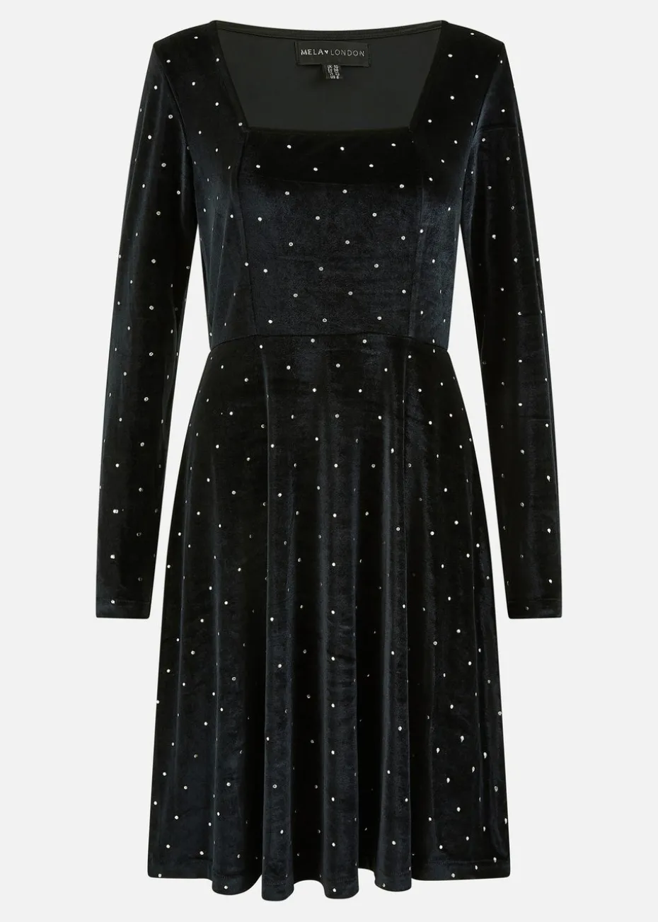Be the first to review “Mela Black Skater Dress With Diamantes and Long Sleeve” Cancel reply