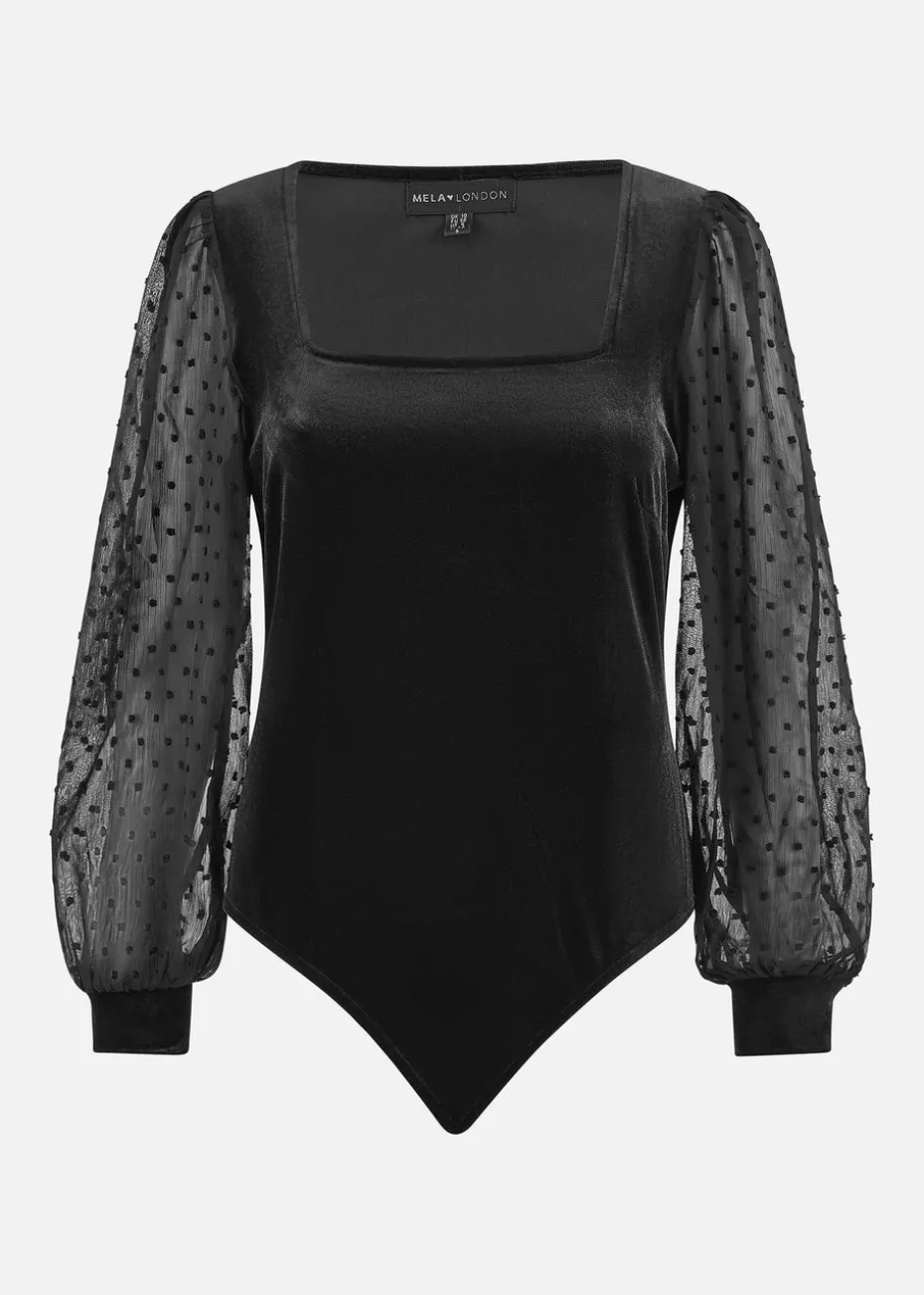 This bodysuit from Mela is perfect for partywear season -With a velvet bodice, sheer polka dot sleeves and a square neckline. Wear with a leather skirt or wide leg trousers for a sophisticated fit this party season.