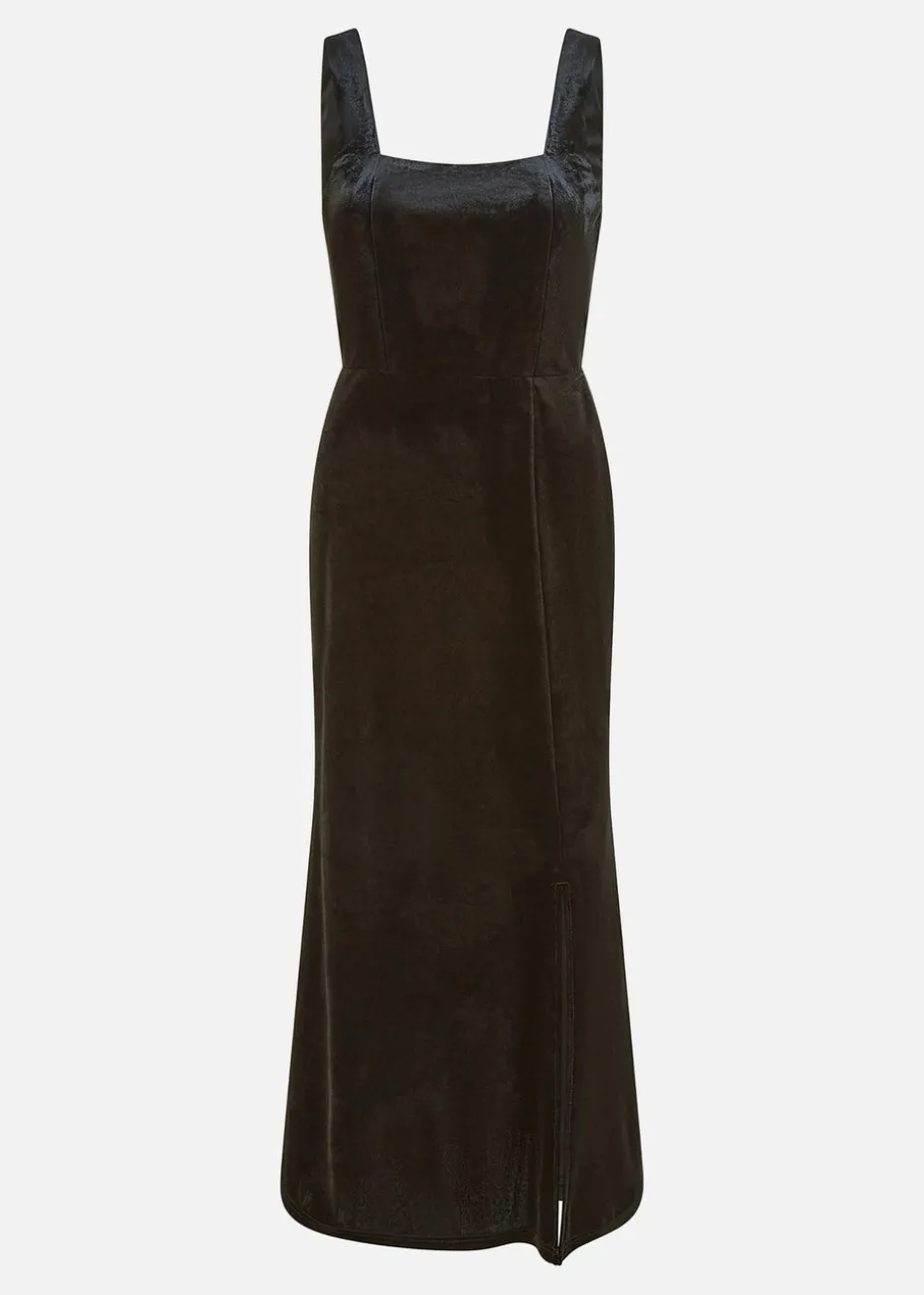 The ultimate little black dress for party season. Crafted from luxurious feeling velvet that features a slight stretch to hug your body and make you feel like a movie star. This simple midi dress is amped up with square neckline, strappy sleeves and a slit in the hemline for a truly smouldering look.