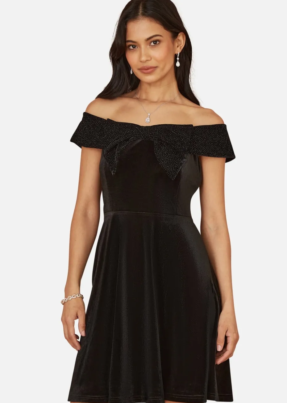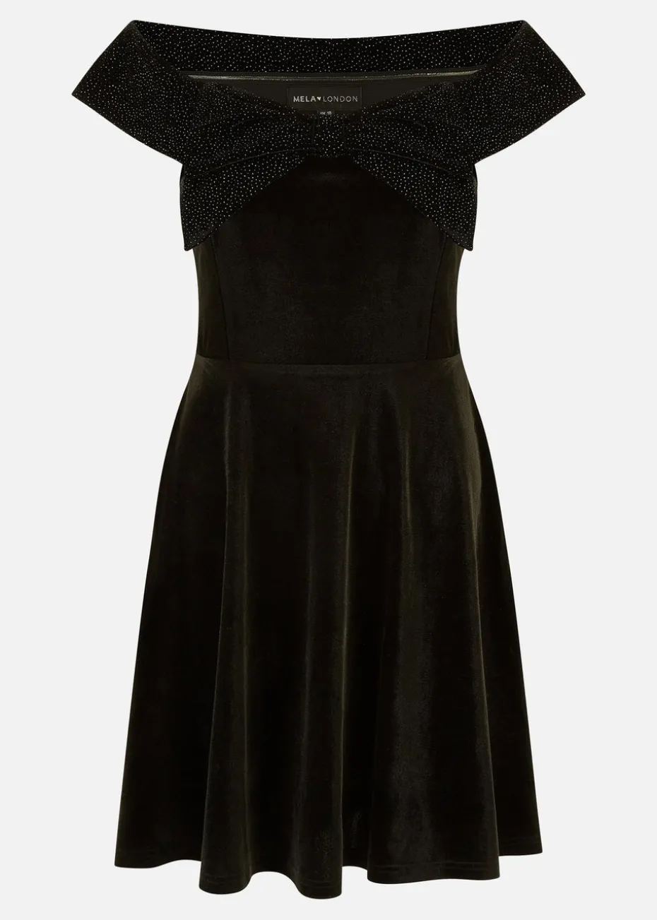 Be the first to review “Mela Black Velvet Skater Dress With Sparkle Bow Neckline” Cancel reply