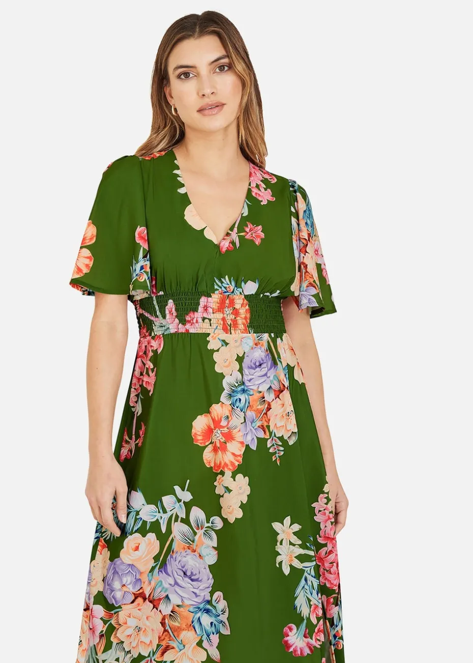 Be the first to review “Mela Green Floral Ruched Waist Maxi Dress With Split Hemline” Cancel reply