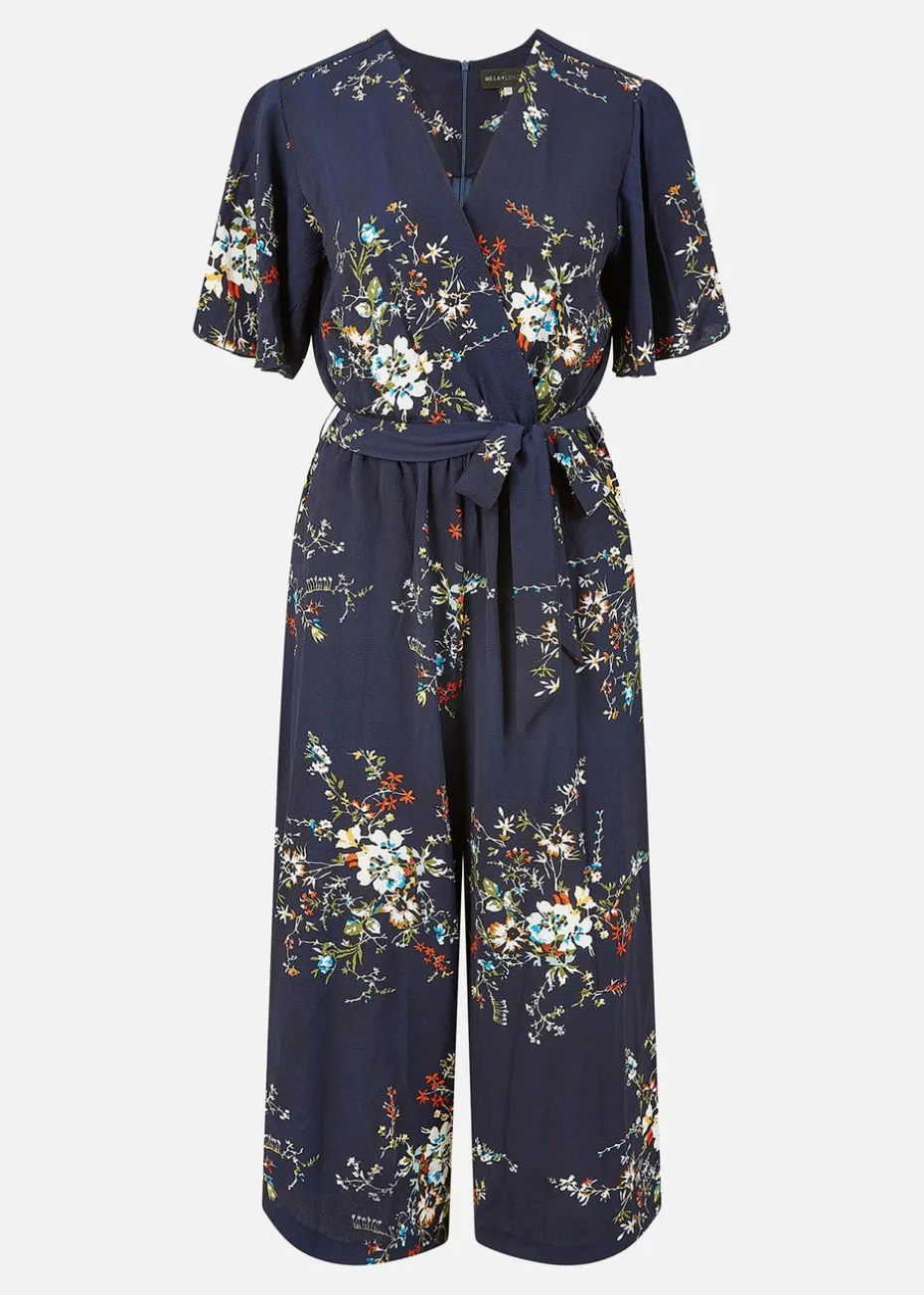 The Mela Navy Floral Print Culotte jumpsuit is the answer to easy dressing. The kimono style sleeves give this piece a lovely silhouette, with a wide leg trouser and self tie waist finishing the fit. With a concealed zipper in the back and our favourite feature on any jumpsuit, pockets! Style with a cute cardi and trainers for a relaxed look.
