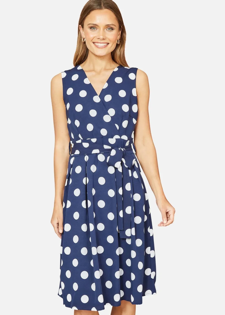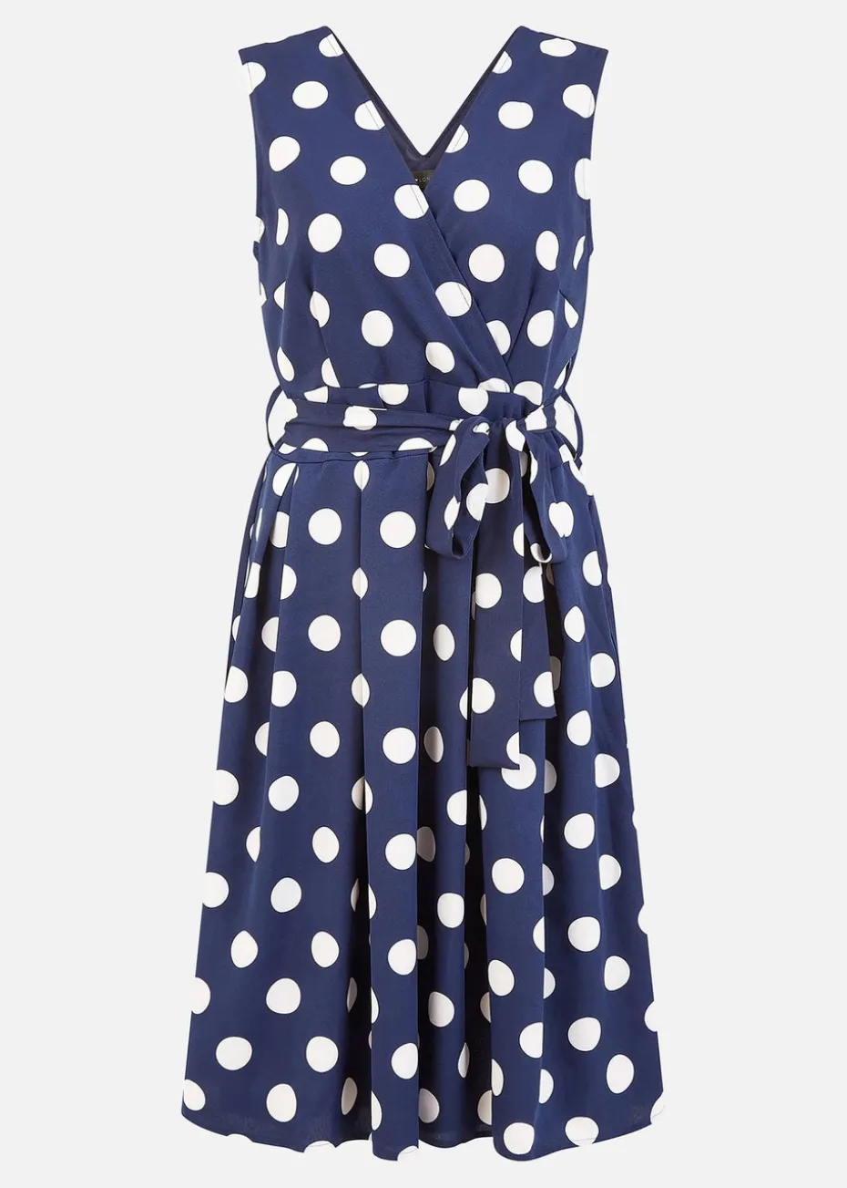 Polka dots just had an upgrade for the new season. This over sized spot print is hosted on a cute and classic skater dress, with a self tie belt at the waist, this sleeveless dress from Mela is perfect for spring wedding invites. With a wrap over V neckline and hemline that falls at the knee.
