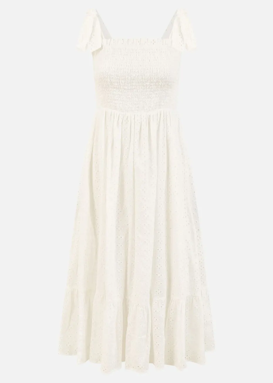 Be the first to review “Mela White Broderie Anglaise Ruched Midi Sundress With Tie Sleeves” Cancel reply