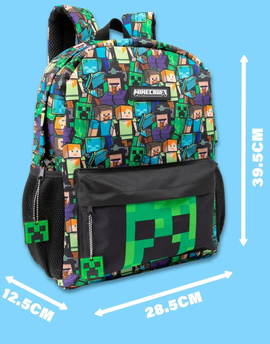 Get your little ones ready for any battles they may face in school with this awesome Minecraft backpack for boys and girls. Featuring the famous villains from the video game: Creeper, Zombie, Skeleton, Enderman and Cave Spiders in an all over print across the front on the bag. This kids black rucksack has a large main green inside compartment and a cool green Creeper face front zipped pocket perfect for all school necessities. Made from 100 percent polyester this Minecraft bag measures approximately 42x31cm and is a must have for your little Minecrafters. This item is 100 percent genuine licensed Minecraft merchandise and features official branding throughout. We want you to get the most out of your new kids Minecraft school rucksack, so please be sure to follow all care label instructions and contact our dedicated customer service team for any additional information or sizing queries. Recommended age: Not suitable for children under 3 years.
