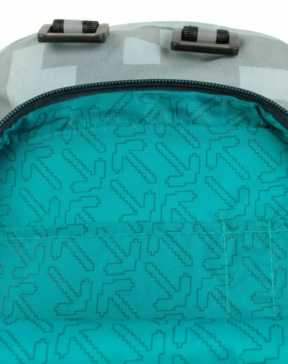 Carry your books around in style with this awesome officially licensed Minecraft Silver Mini Backpack! This eye-catching backpack is packed with awesome detail and comes in a bold grey colour, featuring the iconic pixelated look from the Minecraft games. The bag comes in a mini style, with a height of roughly 30cm and width of 24cm, ideal for little adventurers. This backpack features a moderately sized inside with interior pockets, two adjustable shoulder straps, additional side pockets, and a zip-up front pocket. The inside of the bag is lined in a turquoise material with a repeated pickaxe design and also features a Minecraft badge on the front pocket. A lightweight but sturdy bag, this Minecraft Silver Mini Backpack looks great and will allow you to channel Minecraft vibes on the go!