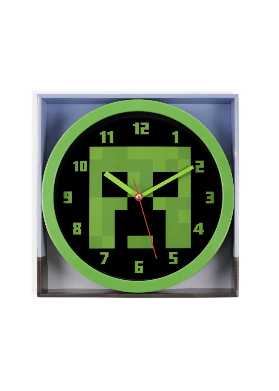 Minecraft green Wall Clock. The wall clock features a printed Minecraft face, 3-hand dial and green outer casing. Packaged in official branded packaging and comes with one year guarantee. Dimensions 250 mm x 20 mm(width, depth)