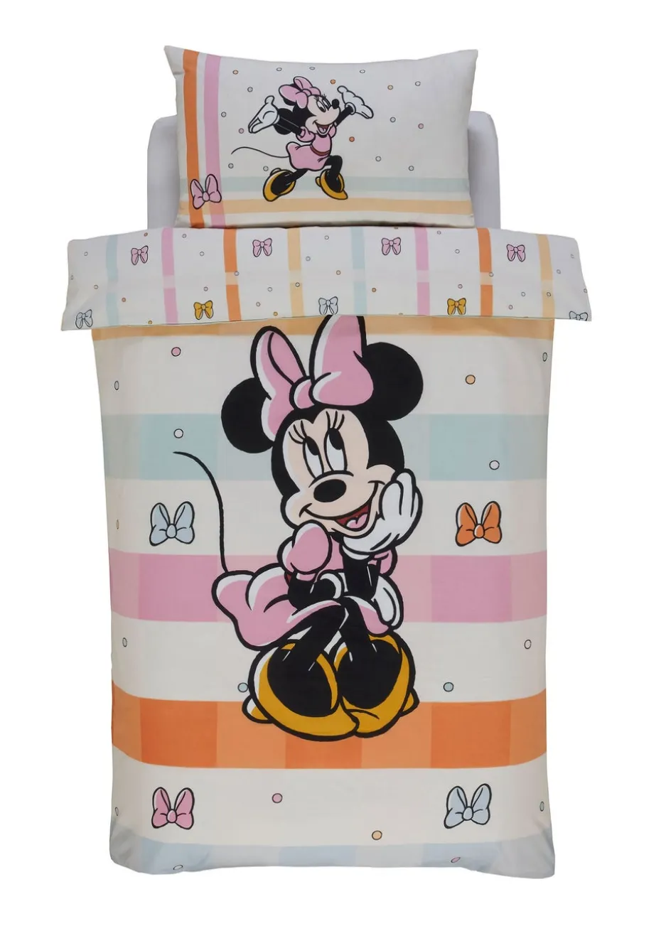 Give your bedroom a splash of colour with this officially licensed Minnie Mouse duvet set, featuring Minnie on a pastel checked background. Includes one single duvet cover (137 x 198cm) and one pillowcase (50 x 75cm). 55% cotton/45% polyester. Machine washable at 30°C and can be tumble dried.