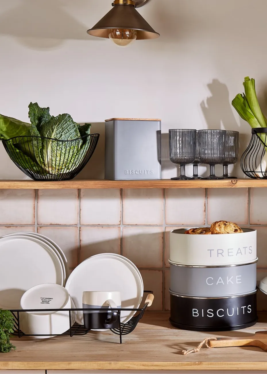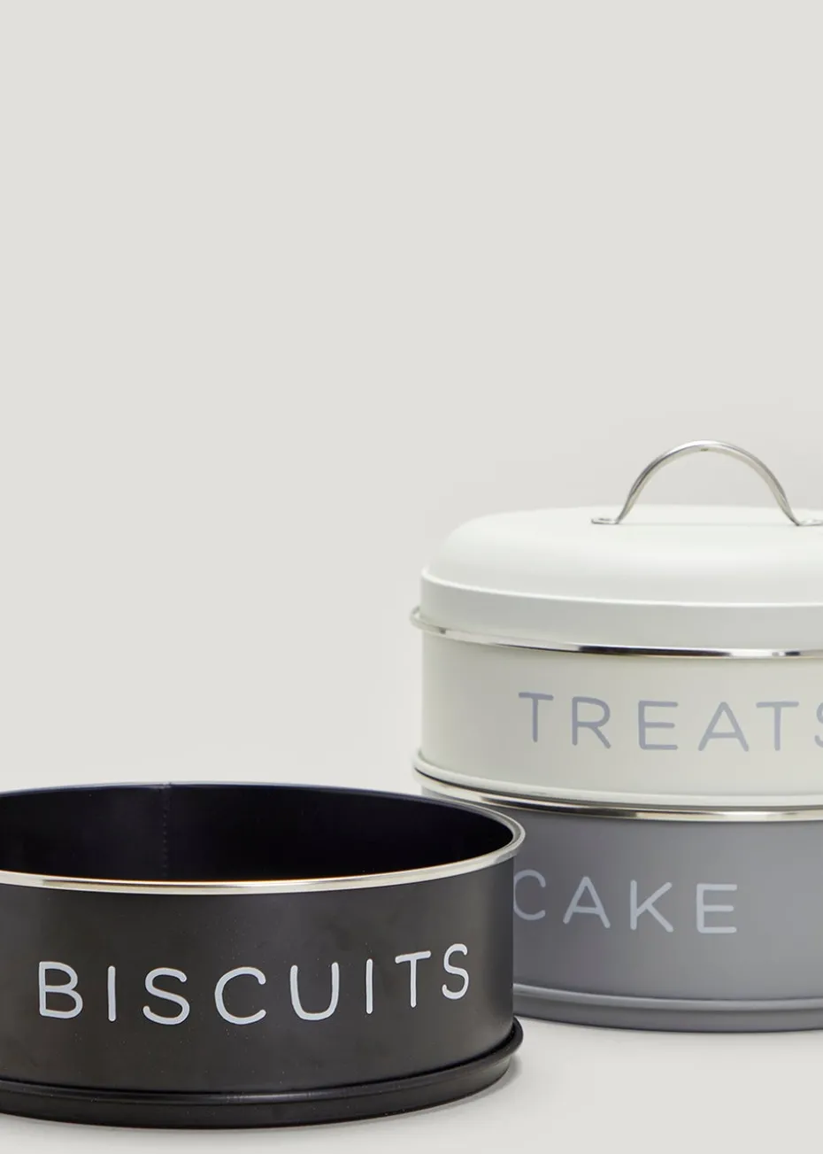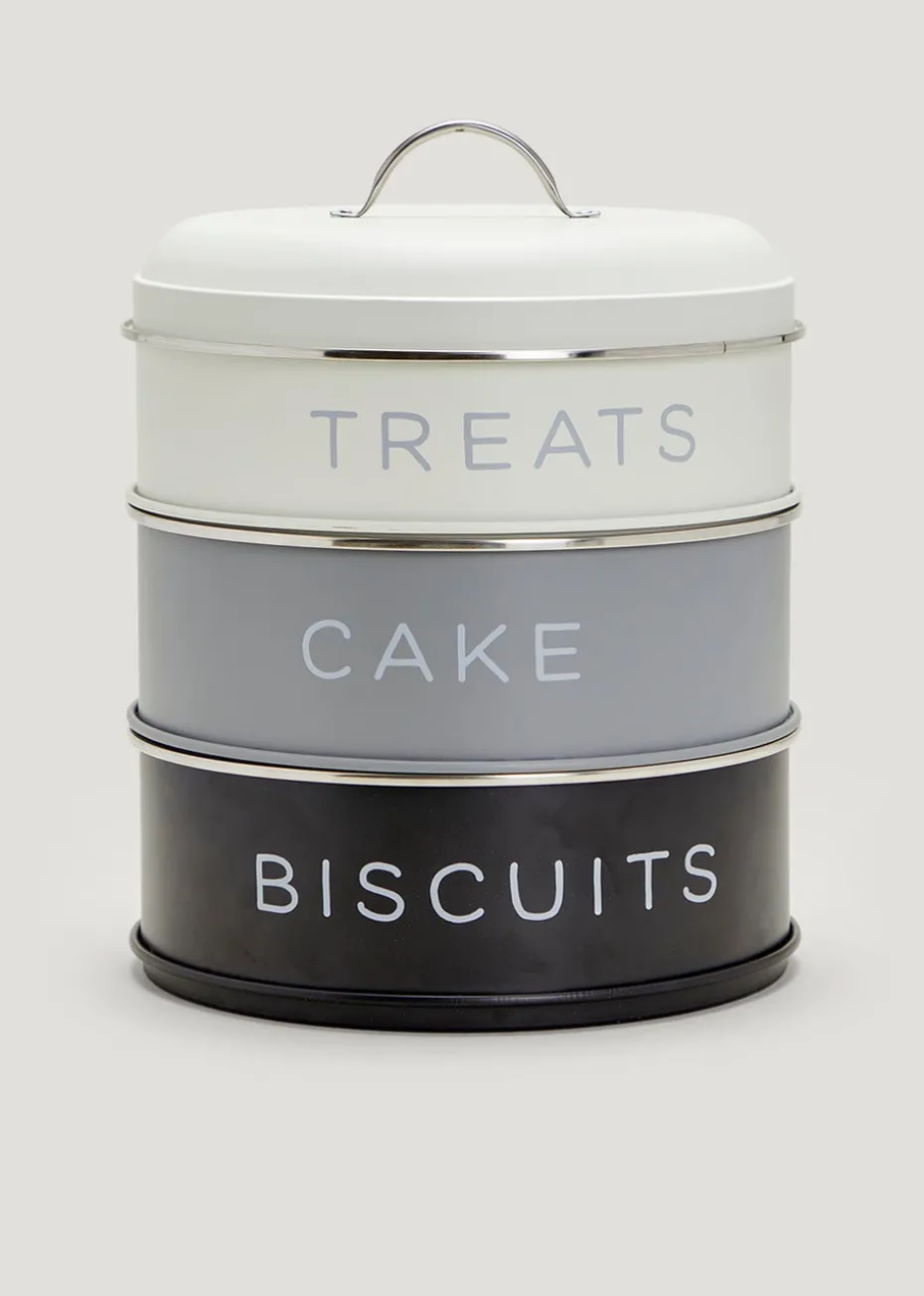Stash away all your delicious baked treats in this set of stylish cake tins. In a stackable design that’s a handy space-saver for any kitchen, these tins come with ‘Treats’, ‘Cake’ and ‘Biscuits’ slogans and a silver metal handle. Matching accessories also available.
