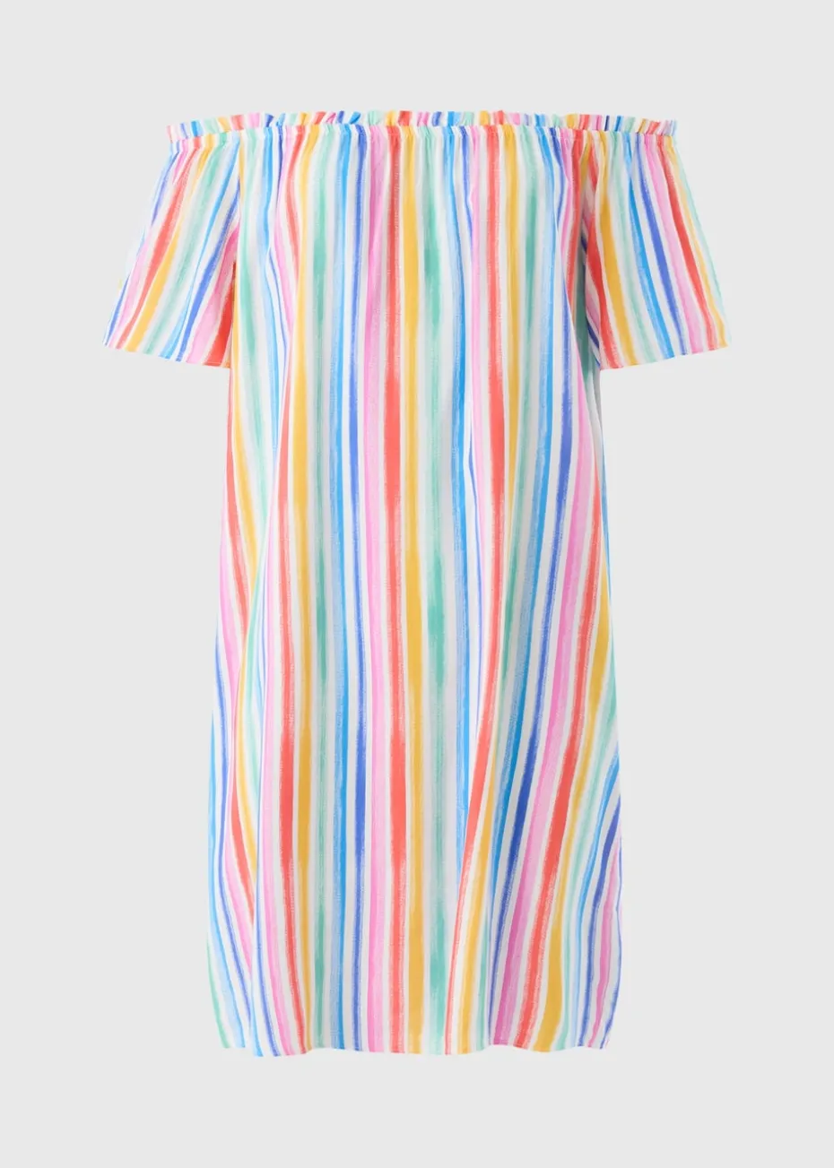 You’ll be sure to turn heads wherever you go in this stunning mini. Featuring a flattering Bardot neckline, this dress is perfect for any occasion. The lightweight viscose fabric is adorned with a vibrant rainbow print that is sure to make you stand out from the crowd.