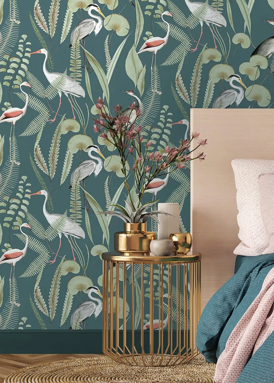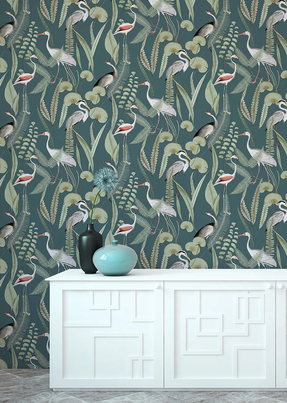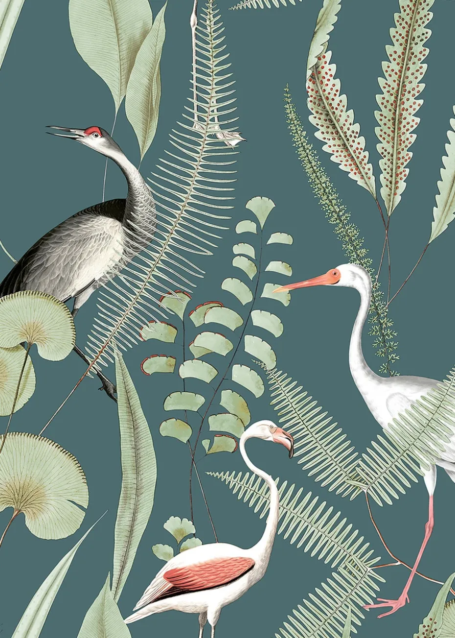 Fabulous hand drawn shorebirds, wading through beautiful water plants. Soft colours on a bold background creates an effective design on this wallpaper.