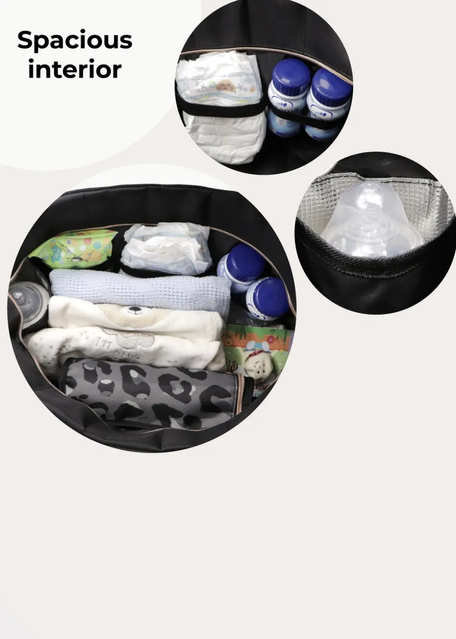The stylish and practical black leopard print changing bag with rose gold detailing provides you with plenty of space to store all your baby’s necessities when you’re out and about. This changing bag comes with a padded changing mat, insulated bottle holder, 2 pockets at the front and an internal pocket, perfect for all your bits and bobs. The adjustable and padded shoulder straps makes carrying this changing bag easy and comfortable.
