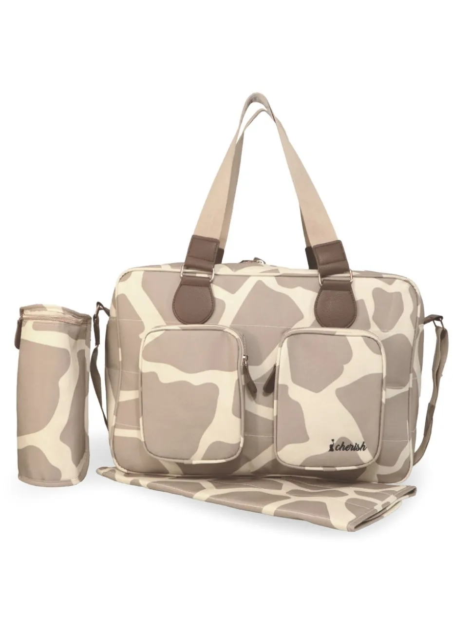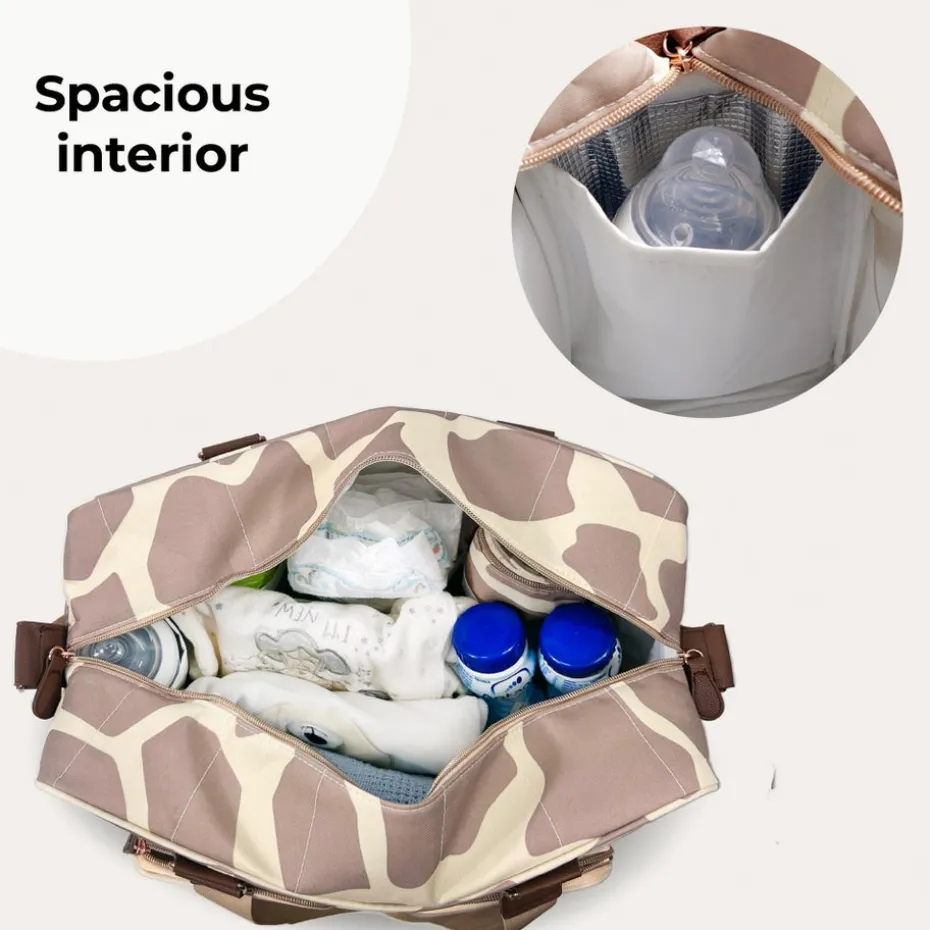 The stylish and practical giraffe print changing bag with rose gold detailing provides you with plenty of space to store all your baby’s necessities when you’re out and about. This changing bag comes with a padded changing mat, insulated bottle holder, 2 pockets at the front and an internal pocket, perfect for all your bits and bobs. The adjustable and padded shoulder straps makes carrying this changing bag easy and comfortable.