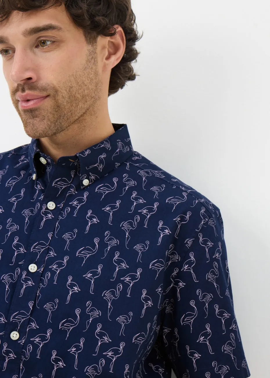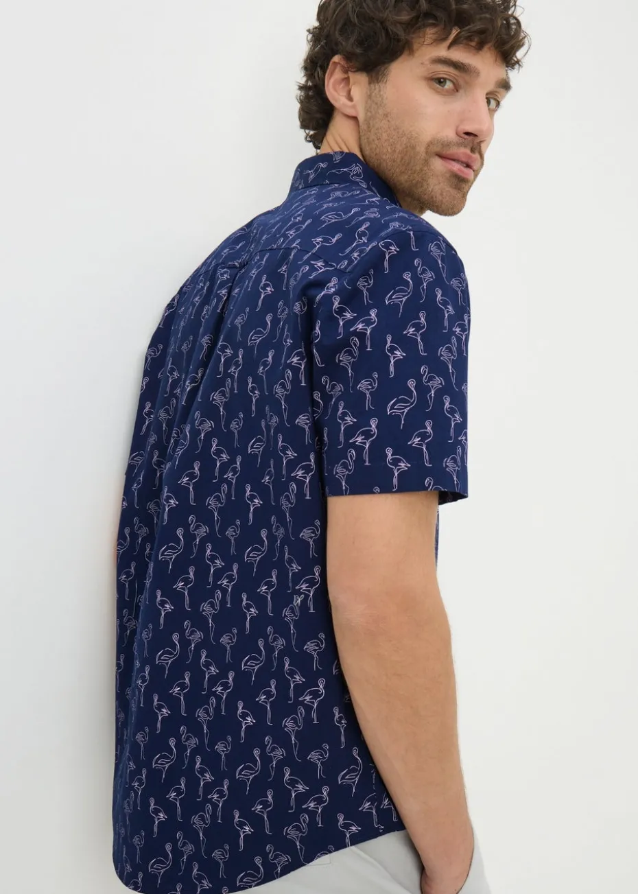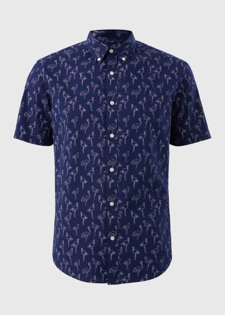Add a fun, tropical twist to your wardrobe with the Navy Flamingo Short Sleeve Shirt. Featuring a playful flamingo print on a rich navy background, this shirt is perfect for those who love to express their individuality while staying comfortable. Whether you’re heading to the beach, enjoying a summer evening out, or just looking to brighten up your day-to-day look, this shirt will make a bold statement.