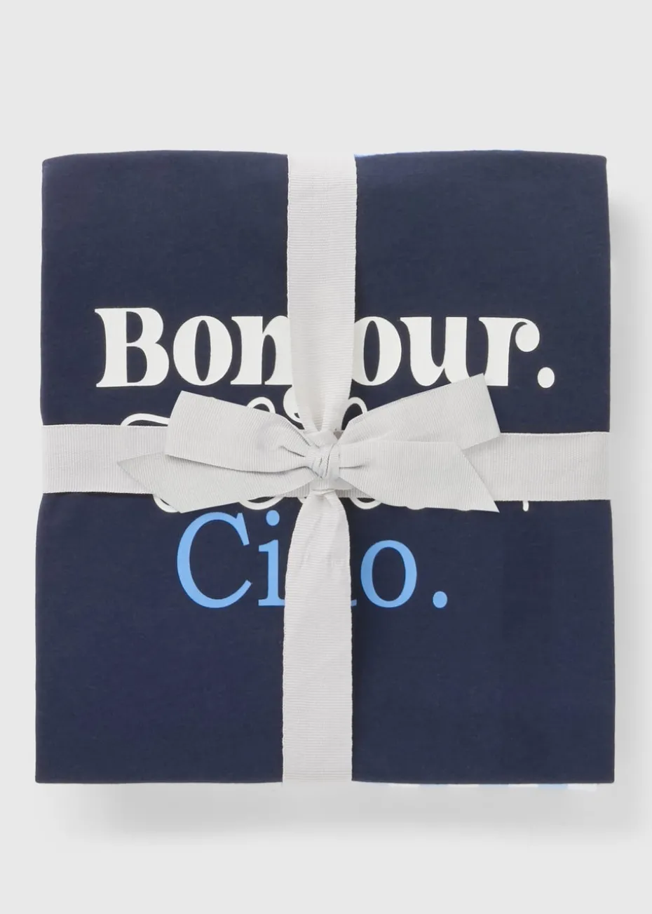 The Navy Gingham Pyjama Set offers a stylish blend of comfort and personality. The navy t-shirt features a fun “Bonjour, Hello, Ciao” graphic on the chest, adding a cheerful, multilingual touch. Paired with blue gingham-patterned bottoms.