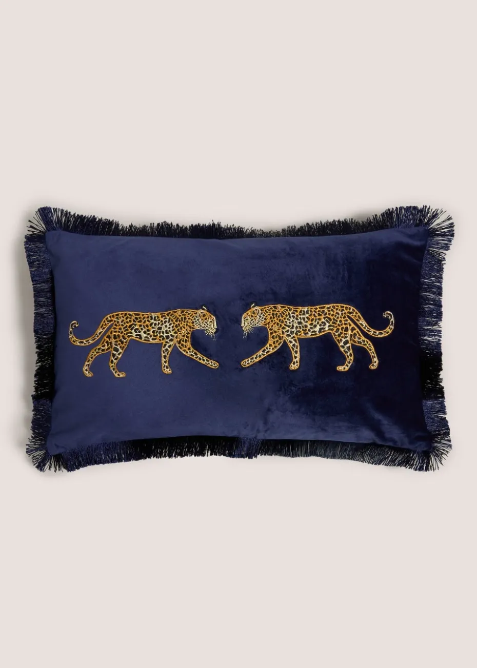 Add a bold touch to your home décor with the Navy Leopard Embroidered Fringe Cushion. Featuring an eye-catching embroidered leopard design on a rich navy backdrop, this cushion is the perfect blend of elegance and wild charm. Finished with stylish fringe detailing, it adds texture and personality to any living space.