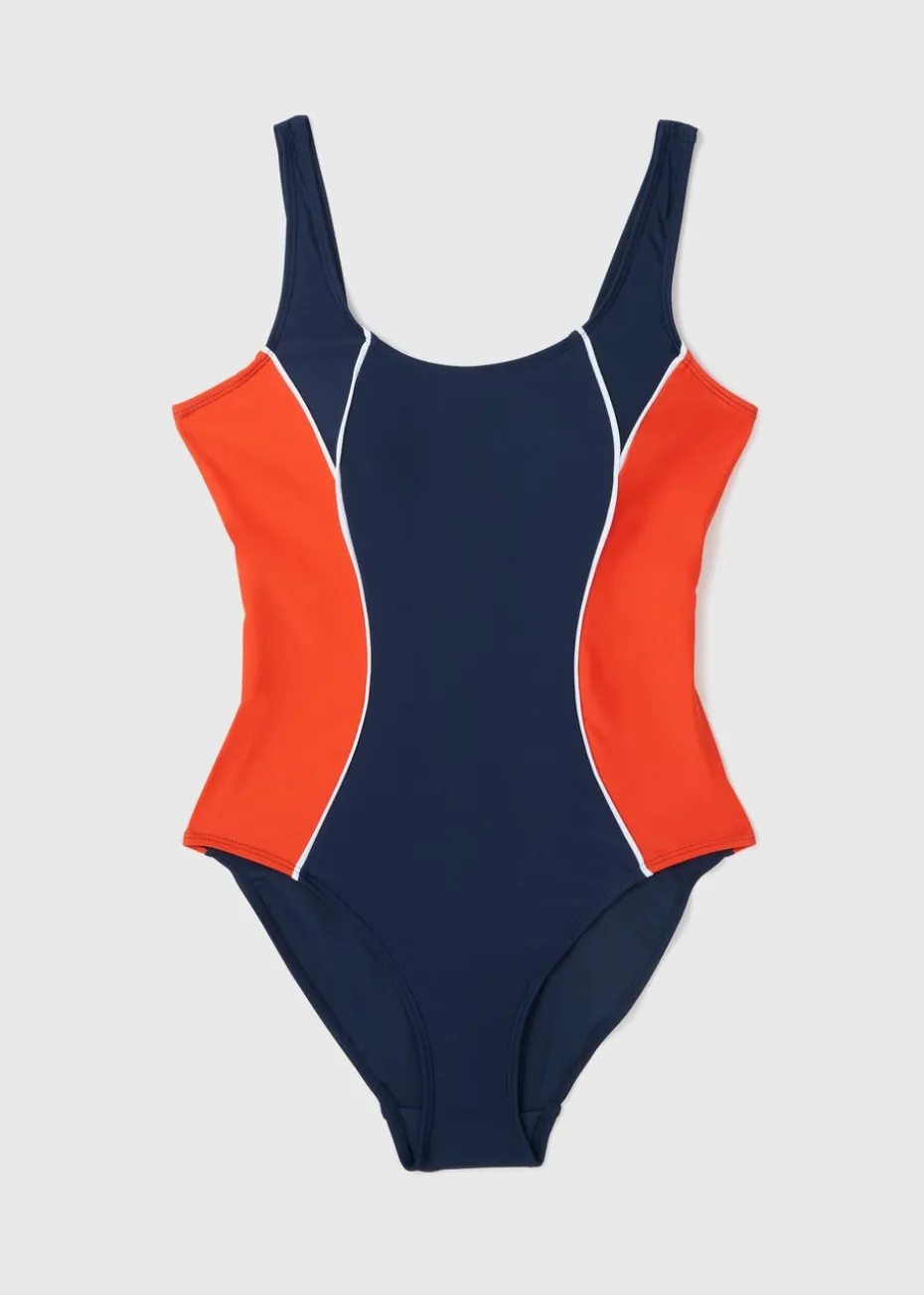 Look effortlessly chic on your next beach holiday with our navy piped detail swimsuit. This swimsuit is designed for those who demand both style and performance with a stylish red side panel with a white piped detailing all round the swimsuit, it effortlessly combines style and practicality. The full coverage with supportive straps ensures a confident wear for all your swimming adventures.