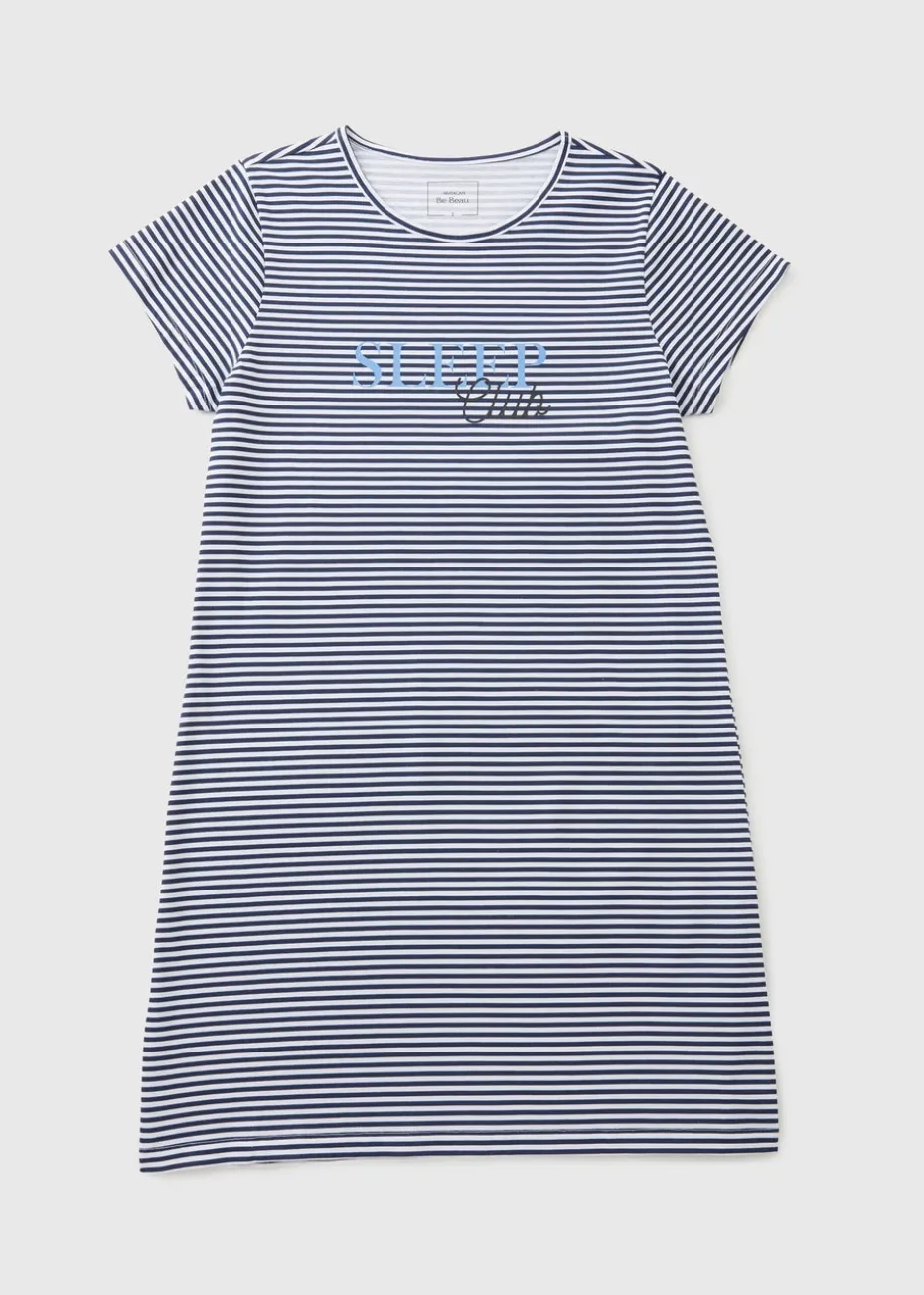 Get ready to unwind in style with the Navy Stripe Sleep Club Nightie. Made from soft, breathable fabric, this nightie combines comfort with a chic design, perfect for a relaxing evening at home. The classic navy and white stripes give it a timeless, nautical-inspired look, while the relaxed fit ensures you sleep soundly all night long.