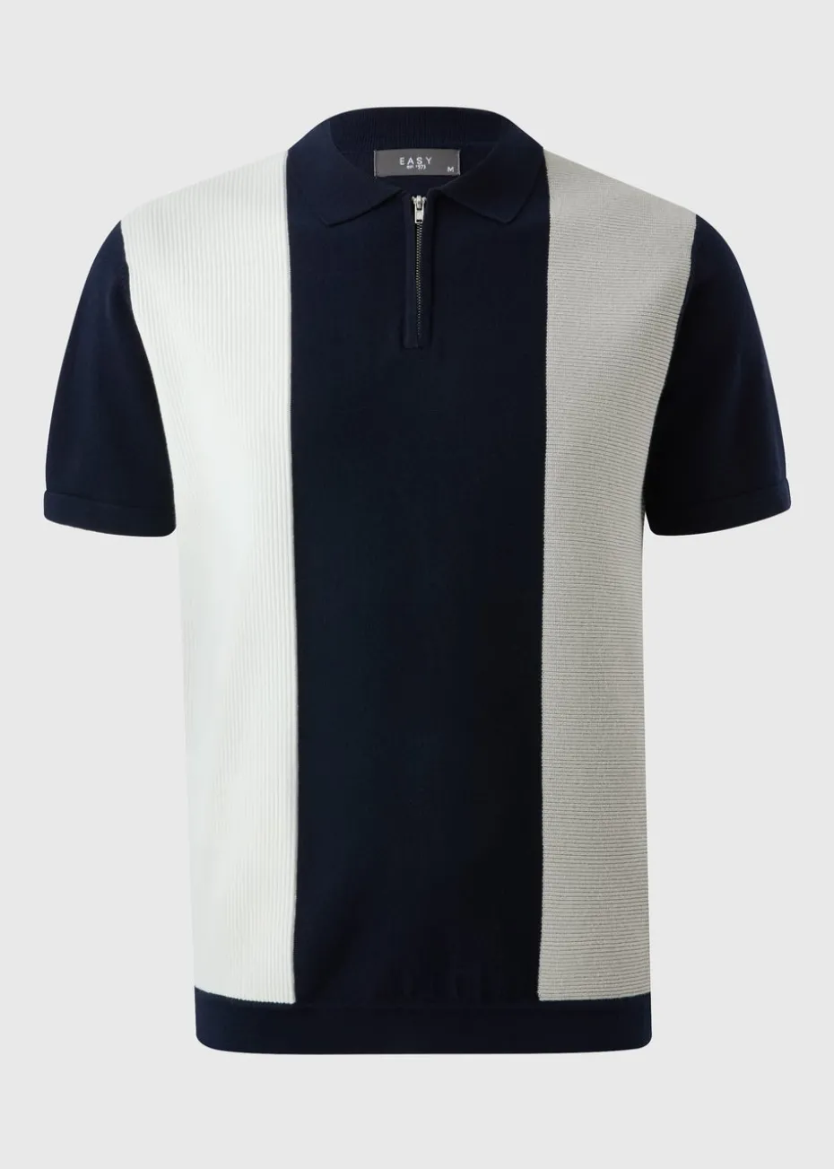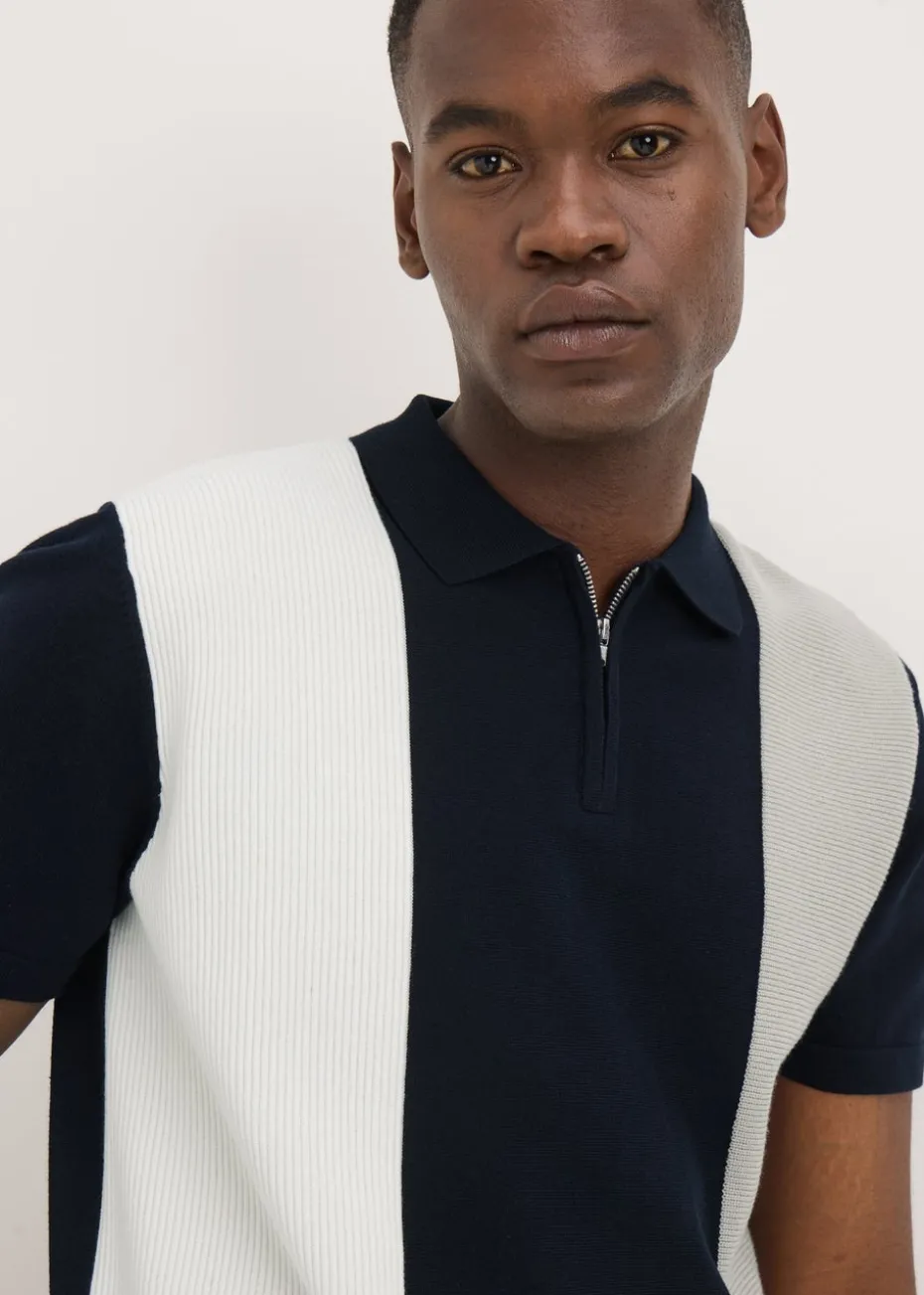 Add a fresh touch to your smart-casual wardrobe with this Navy Stripe Textured Zip Polo Shirt. Crafted from a soft, breathable fabric, it features a subtle textured stripe design for added depth and style. The modern zip-up collar adds a contemporary twist to the classic polo silhouette, making it perfect for both laid-back weekends and polished daytime looks. Pair it with chinos or denim for effortless style.