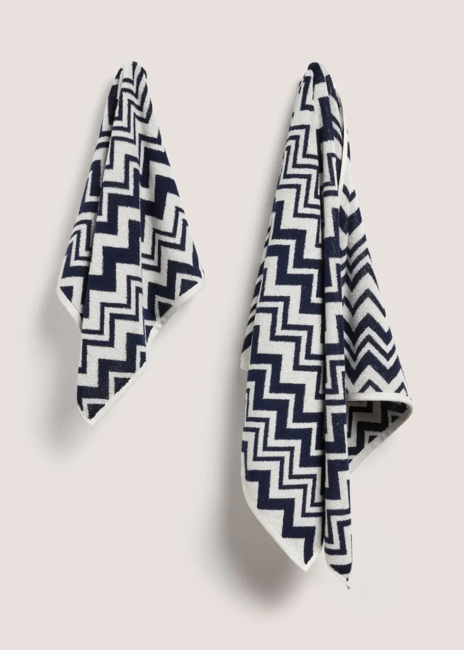 Add a stylish touch to your bathroom or beach days with the Navy and White Zigzag Towel. Featuring a bold zigzag pattern in classic navy and white, this towel offers both contemporary design and functionality. Crafted from soft, absorbent cotton, it provides excellent comfort and quick-drying performance, making it perfect for daily use in the bathroom or trips to the pool or beach.