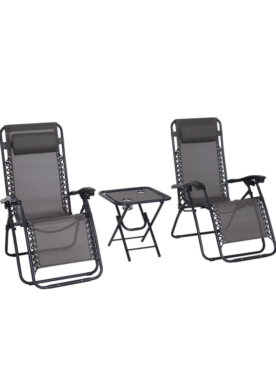 Lounging with a friend has never been so relaxing, thanks to this three-piece garden table and chair set by Outsunny. It includes two fully adjustable zero-gravity chairs that take the weight off your body and evenly distribute your weight, relieving any pressure you may have. Made from strong steel with a powder coat, they feature soft, adjustable pillows, wide arm rests and a durable and breathable texteline fabric cover to ensure comfort for years to come. The set comes complete with a matching table, also made from steel, with two built-in cup holders, so you won have to get up and fetch your drink once you’ve sat down. Its perfect for when you want to unwind for hours on end. Dimensions: Chairs upright: L 90cm x W 65cm x H110cm. Chairs reclining: L 160cm x W 64cm x H 79cm. Table: L 50cm x W 50cm x H50cm. Folded Dimensions: Chairs L 64cm x W 12cm x H 94cm. Table L 65cm x W 50cmx H 5cm. Weight capacity: Chairs 150kg. Table 40kg. Features: Flat pack Breathable and durable texteline cover on chairs. Foldable for easy storage and transportation. Chairs can recline and adjust and feature a padded headrest. Double bungee support system on chairs.