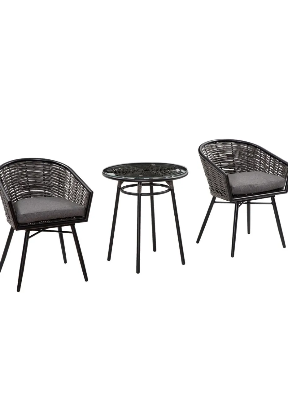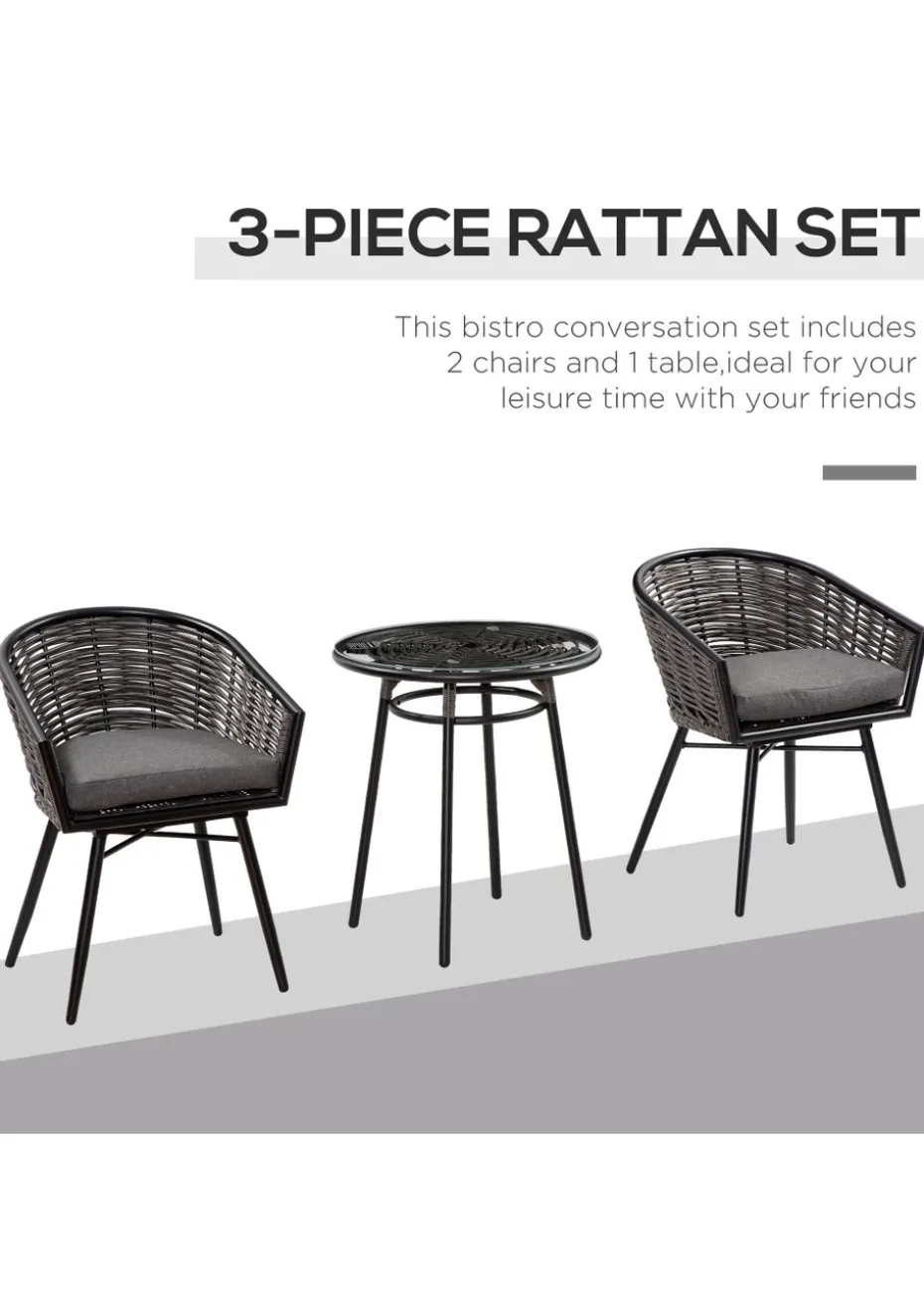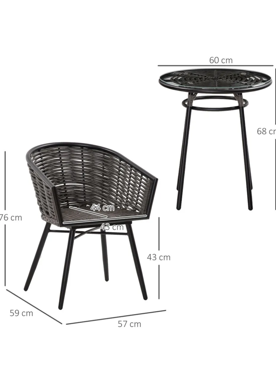 This 3-piece bistro set from Outsunny is perfect for al fresco dining. The set includes two ergonomically designed chairs and one round coffee table. Crafted from durable round PE rattan wicker and a steel frame, additional features include a tempered glass tabletop, ensuring cleaning with a damp cloth. The chairs come with soft padded cushions with zippers for ease of removing and washing. A great choice for sprucing up your patio or decking area. Includes x2 round wicker woven chairs and x1 coffee table Round PE rattan and steel frame Tempered glass table top Soft padded cushions Washable cushion covers with zippers Assembly required Chairs: W57cm x D59cm x H76cmSeat: W43cm x D44cmSeat Height (without cushion): 43cmCushion Thickness: 4cmTable: W60cm x D60cm x H68cmWeight Capacity: 160 kg(single seat), 30 kg(table)