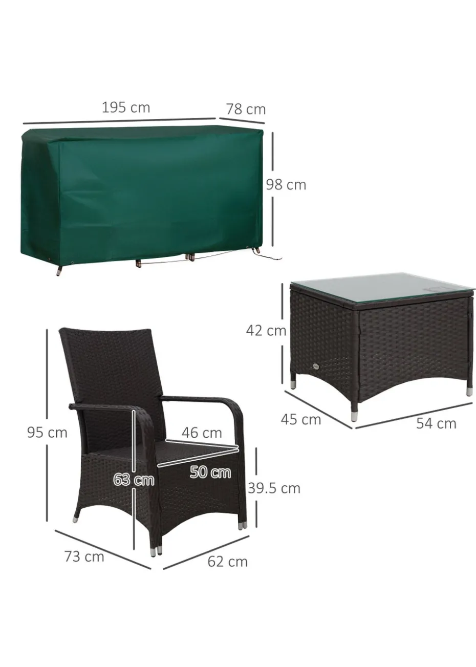This outdoor bistro set by Outsunny is an ideal choice for your garden, patio or balcony. Combined with a steel frame structure and covered with timeless PE rattan, the set comes with two seats that hold two cushions, as well as a table with a sleek glass top to place drinks and magazines. The stylish modern design can blend into any modern home decor. Dimensions: Chair: W62cm x D73cm x H95cm. Tea Table: W54cm x D45cm x H42cm. Seat: W50cm x D46cm x H39.5cm. Armrest: W6cm x H63cm. Max Loads: Single Chair: 160kg. Tea Table: 30kg. 1 water resistant Oxford cloth cover included. Seat cushion covers are removable and washable. Lightweight and portable for easy transport. Polyester cloth is fire-retardant to British standards. Assembly required. Net Weight: 19kg.