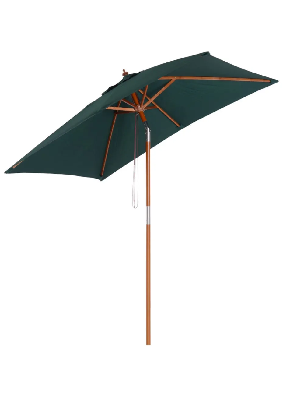 Keep yourself shaded from the sunshine with this timeless parasol from Outsunny. In a beautiful caramel brown stained finish solid wood forms the central pole to ensure a tough and durable structure. On the top a green large square canopy sits. Made from 180g polyester to provide UV protection the parasol’s angle can be adjusted and it features eight bamboo ribs for extra support between the frame and canopy. It’s finished with a pull rope for easy opening and closing. The perfect blend of beauty and function. Dimensions: L 200cm x W 150cm x H 230cm. Features: Attractive and stylish parasol umbrella to keep you protected from the sun. Large canopy provides lots of shading area. Solid wood central pole for a tough structure which keeps upright all day long. Six bamboo connectors from pole to canopy for extra support. Tilt mechanism to position the canopy to a suitable angle. Pull rope for easy and smooth opening and closing. Not suitable for heavy weather. Assembly required. Specifications: Brand Name: Outsunny Colour: Green. Material: Wood, Bamboo, Polyester. Net Weight: 4.5kg. Overall Dimension: 200L x 150W x 230Hcm. Umbrella Pole Diameter: 38mm. Flat Pack: YES. Custom Label: 84D-017GN.