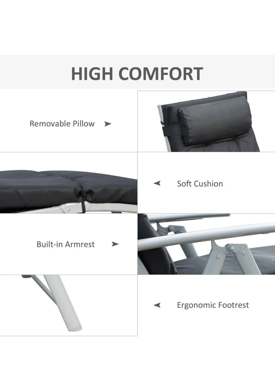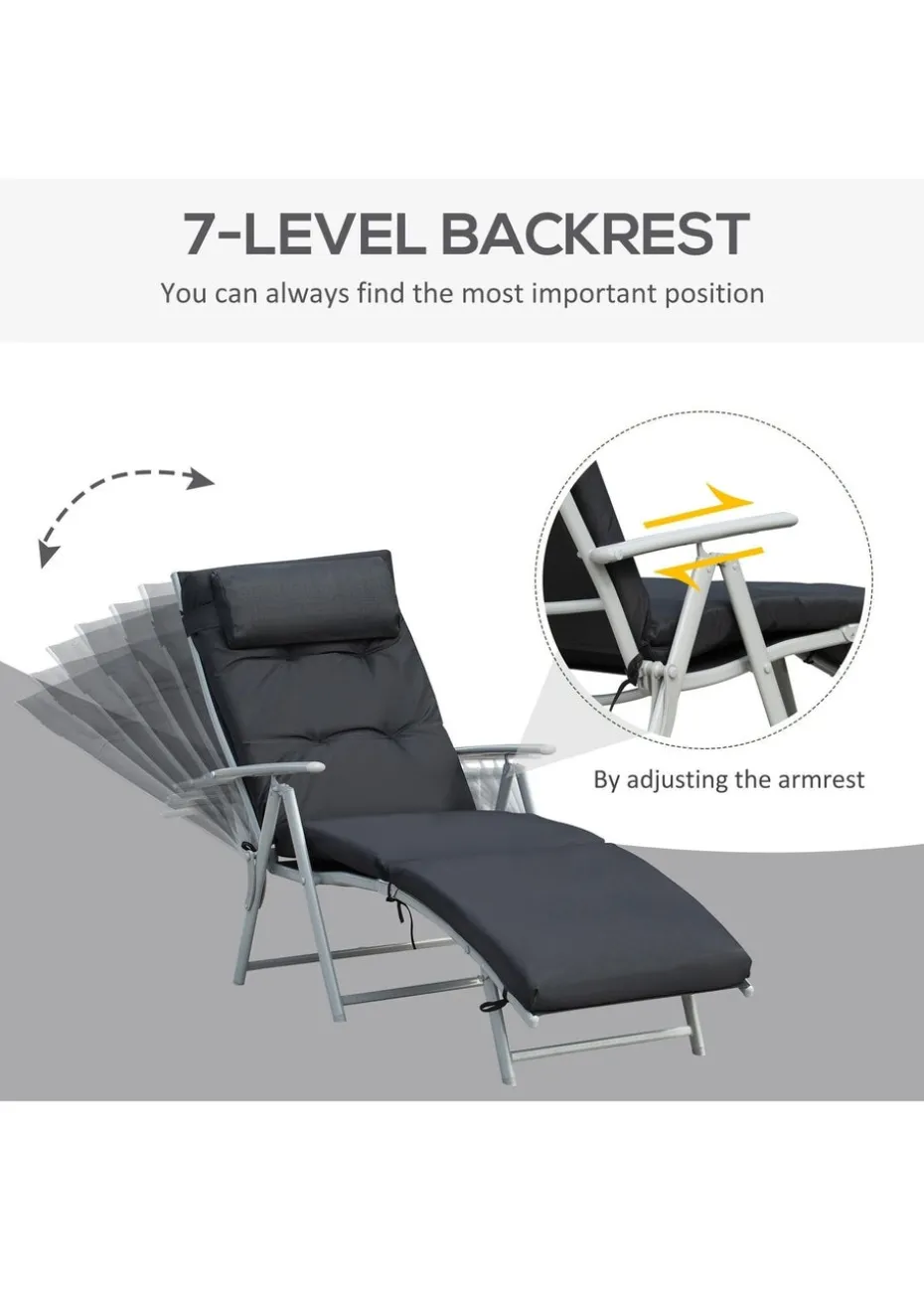 Bring classic comfort to your garden with this Outsunny reclining garden chair. A steel frame for a strong core comes with a seven-level adjustable back – relax in a position you want. The removable cushion seat keeps you comfortable, with a detachable pillow for the head and neck. Foldable frame to carry and more easily.• Item Name: Cushion folding lounge • Brand Name: Outsunny • Colour: Black • Other Colours: Silver • Material Used: Steel, Texteline, Fabric,Cotton • Product Dimension: 137L x 63.5W x 100.5Hcm • Seat Size:53.5W x 115Dcm • Seat to Floor Height:33cm • Foldable Size: 81.5L x 20.5W x 64.5Hcm • Weight Capacity: 165kg • Net Weight: 10kg• Flat Pack: Yes • Custom Label: 84B-184V70BK