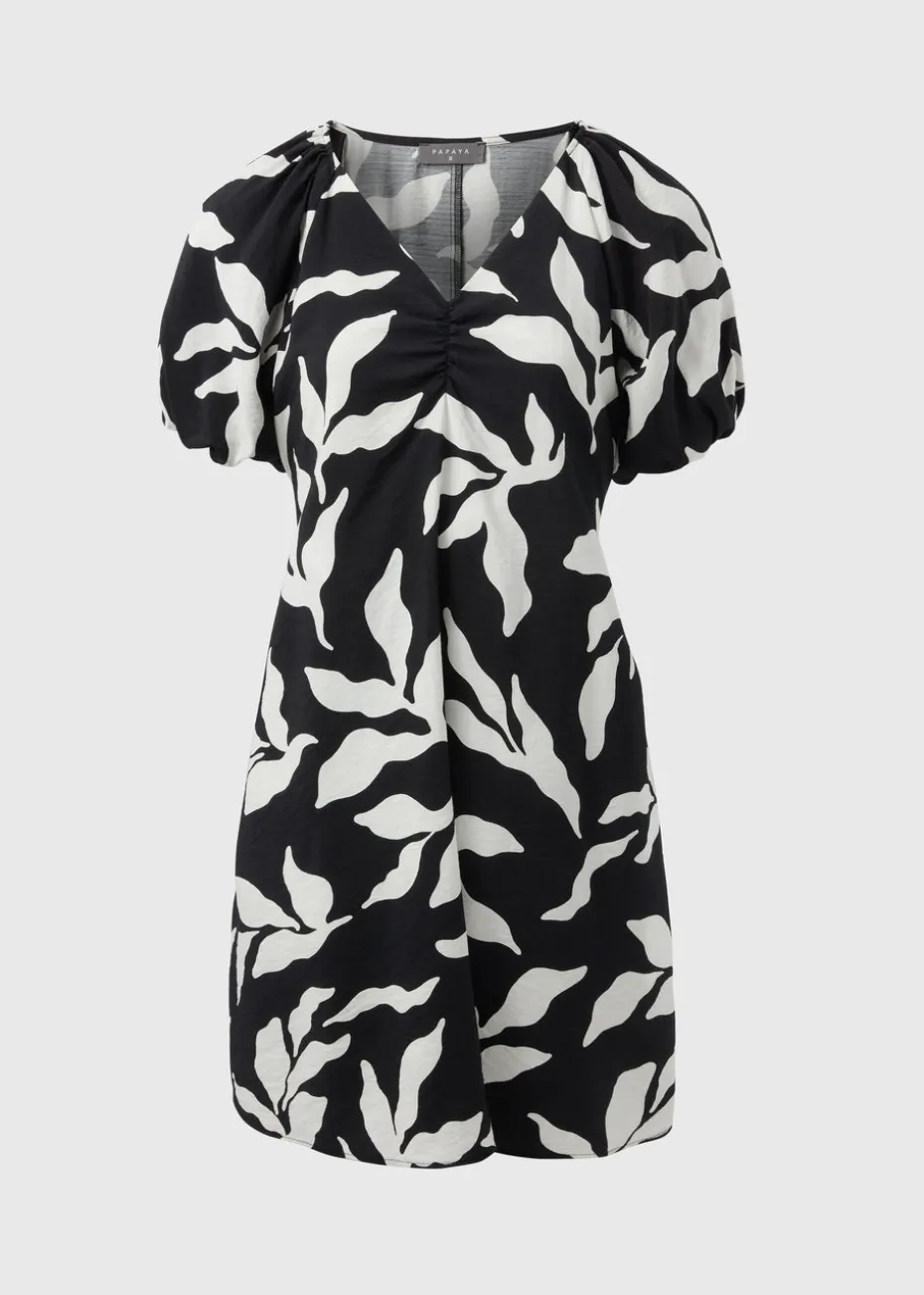 Elevate your wardrobe with the Papaya Petite Black Leaf Puff Sleeve Mini Dress, designed to bring a touch of elegance to your everyday look. This petite-fit dress features a sophisticated black base with a delicate leaf print, creating a timeless yet modern appeal. The puff sleeves add a stylish, feminine touch, while the flattering mini length makes it perfect for both casual and dressy occasions. Crafted from a lightweight, comfortable fabric, this dress is ideal for effortless styling.