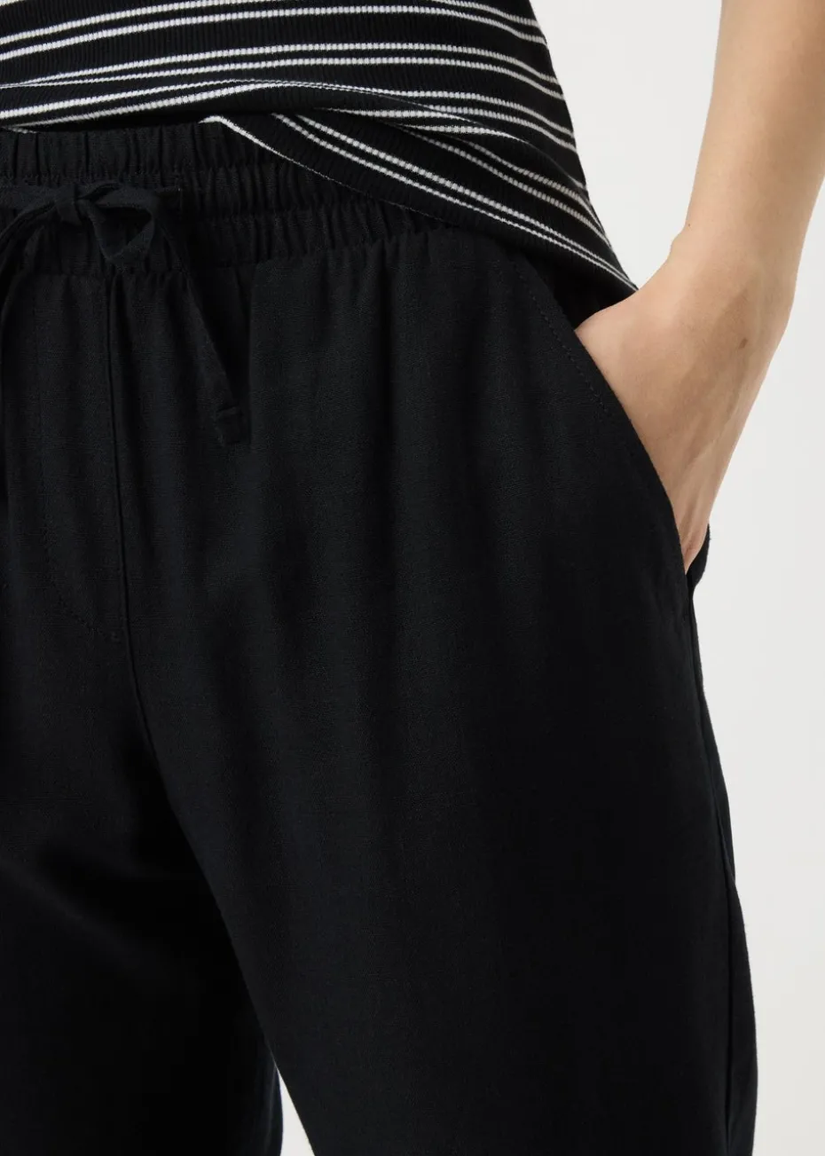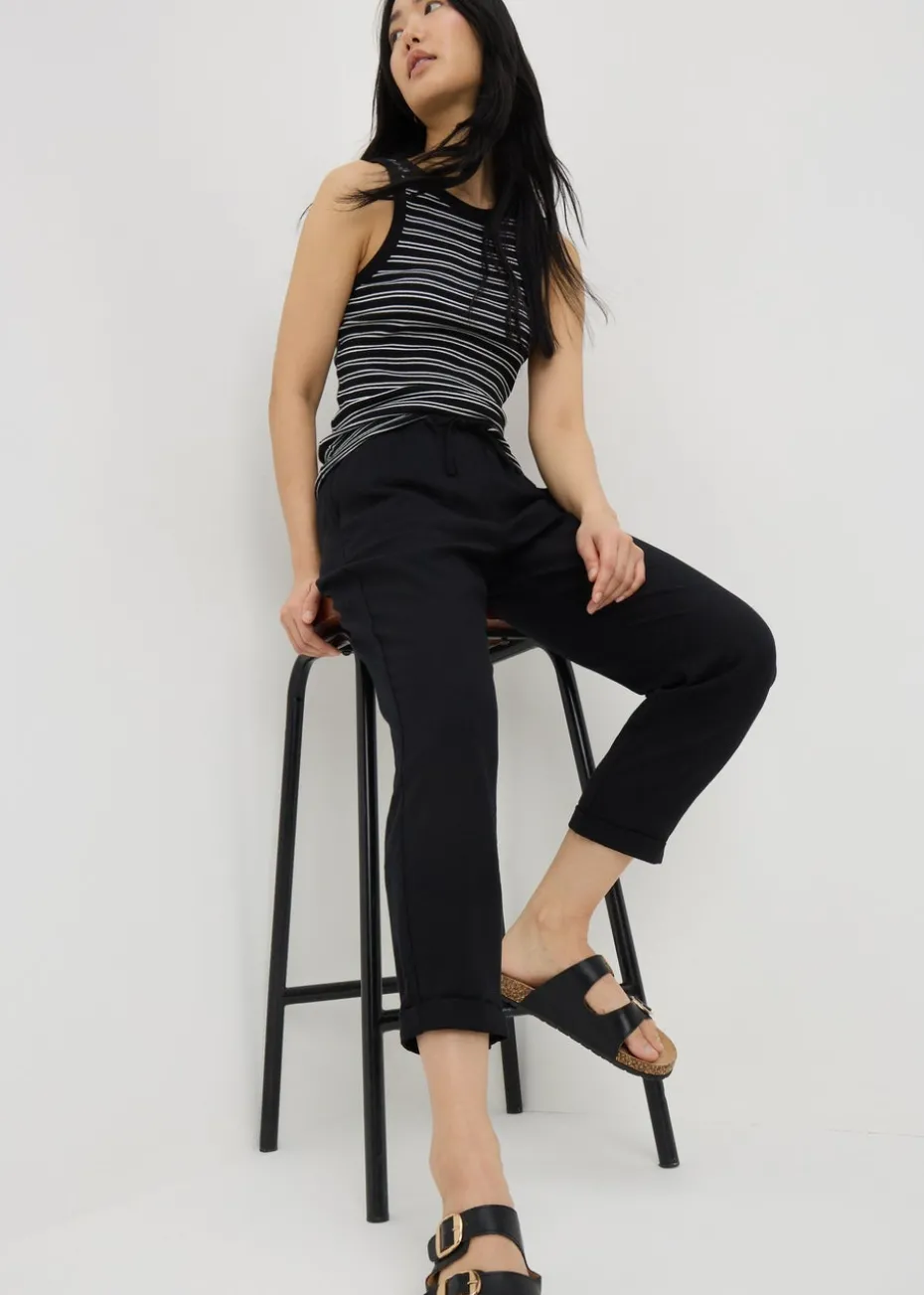 Elevate your wardrobe with the Papaya Petite Black Linen Blend Tapered Trousers, a versatile and stylish essential for any occasion. Made from lightweight linen blend fabric, these trousers offer breathable comfort, making them perfect for warmer weather or layering in cooler months. The tapered fit adds a modern touch, creating a flattering silhouette that works for both casual and semi-formal settings.