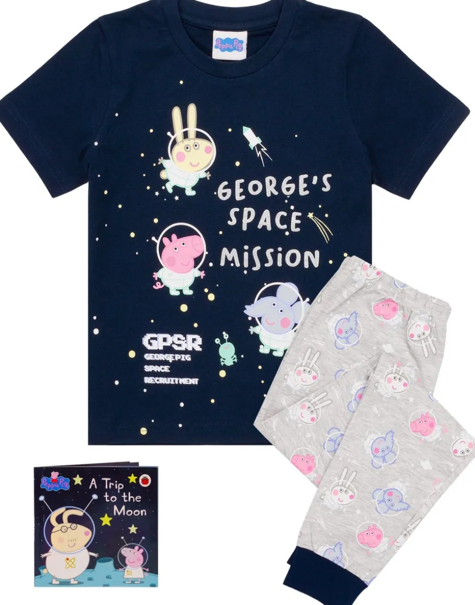 Join George Pig on his next space mission with character friends Rebecca Rabbit, Mr Elephant, and Daddy Pig with this adorable George Pig pyjamas set that comes with a bedtime story ‘A Trip to the Moon’, perfect for boys and girls! Awesome for keeping your little ones comfy whilst watching their favourite kids show or reading their bedtime story, these Peppa Pig pjs come with a short sleeve navy top and grey long length bottoms. The George Pig t-shirt showcases fan favourite characters in space astronaut outfits with text reading ‘George’s Space Mission’.