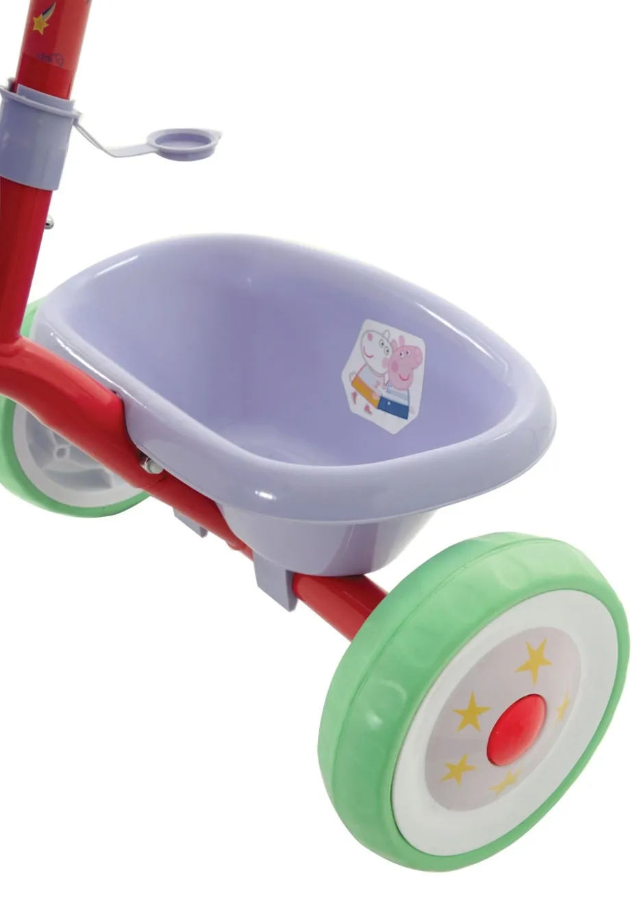 Get on the move with this super cool Peppa trike featuring character favourites! Perfect for little ones finding their feet, this ride-on is not only designed for comfort with it’s moulded seat and soft handlebar grips, but safety also with wide, puncture-proof EVA tyres for stability and sturdy steel frame. A front mudguard prevents riders from getting too messy and protects from debris. The easy switch front wheel clutch mechanism allows kids to rest their feet on the pedals in parent push-along mode, whilst using the adjustable parent handle. The handle can be removed and pedals engaged once your child is ready to go it alone, improving confidence and coordination. Can be adjusted to growing children as confidence and ability improves with adjustable handlebar height of 50-53cm and a seat height of 32cm. The removable rear bucket is great for ride-along storage for all your favourites toys!