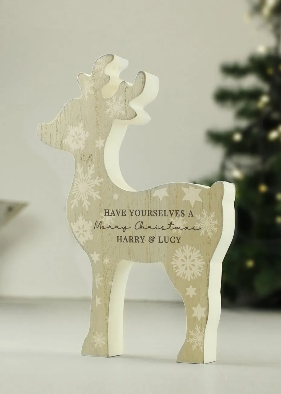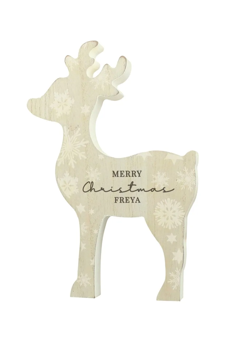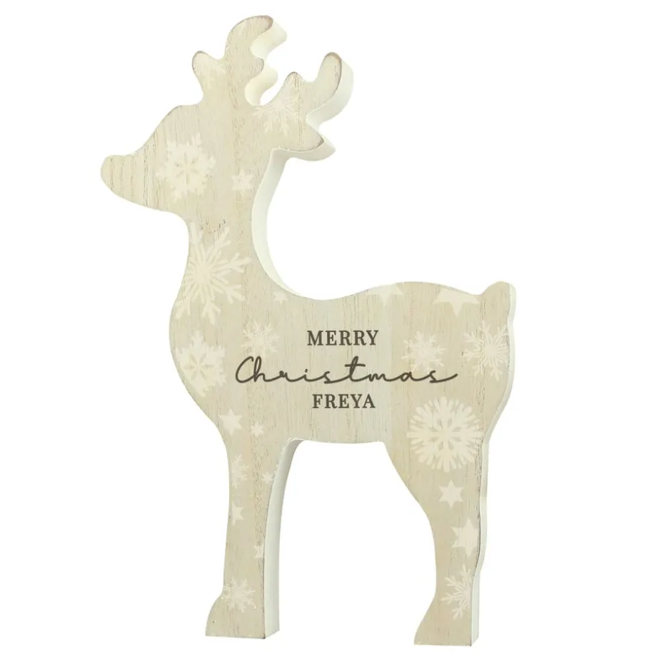 Our rustic wooden reindeer decoration will add a touch of shabby chic glamour to any home this Christmas. The wooden reindeer decoration can be personalised with the following Line 1 – 25 characters (Fixed uppercase) Line 2 – 20 characters Line 3 – 25 characters (Fixed uppercase) The material is wooden with a shabby-chic finish. Ideal for Christmas *When you have placed your order, you will receive an email from [email protected]. Follow the link to submit the personalised details you require. *If we don’t receive your personalisation within 24 hours the order will be cancelled. Please check your junk folder for the email. *Once personalisation has been submitted the order cannot be cancelled or amended as it will automatically be sent into production and will be despatched within 3 working days. Product Dimensions in CM 14.7 x 22 x 2.4