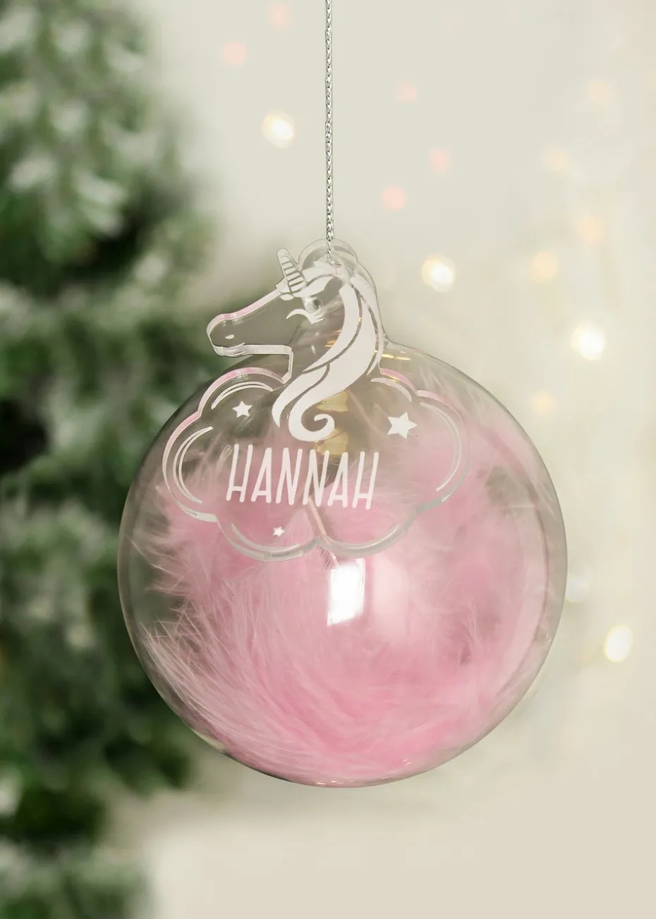 Each glass bauble is filled with a delicate pink feather, which will look great hung on any Christmas tree!