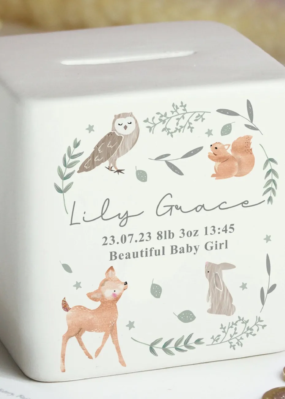 This Personalised Woodland Animals Square Money Box makes the perfect keepsake for that special occasion.