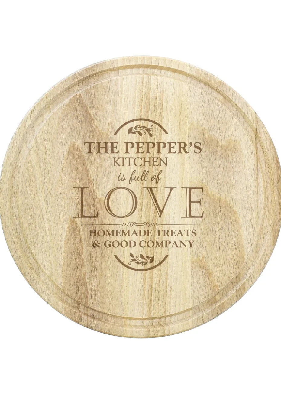 Personalise this Full of Love Round Chopping Board with a couple’s or family’s surname up to 15 characters and up to 2 lines of 20 characters each for a message. ‘Kitchen is full of love’ is fixed ‘The’ is not fixed If an ‘s is required please add this in the personalisation. Please enter personalisation in capitals if required as imaged. Please note as the chopping board is a natural wood product, colour and grain may vary from board to board. This may also cause the engraving to appear slightly darker or lighter in places, however the surface should be smooth and even. Perfect for Wedding, Anniversary and Birthdays. *When you have placed your order, you will receive an email from [email protected]. Follow the link to submit the personalised details you require. *If we don’t receive your personalisation within 24 hours the order will be cancelled. Please check your junk folder for the email. *Once personalisation has been submitted the order cannot be cancelled or amended as it will automatically be sent into production and will be despatched within 3 working days. Product Dimensions in CM 25 x 25 x 1.5