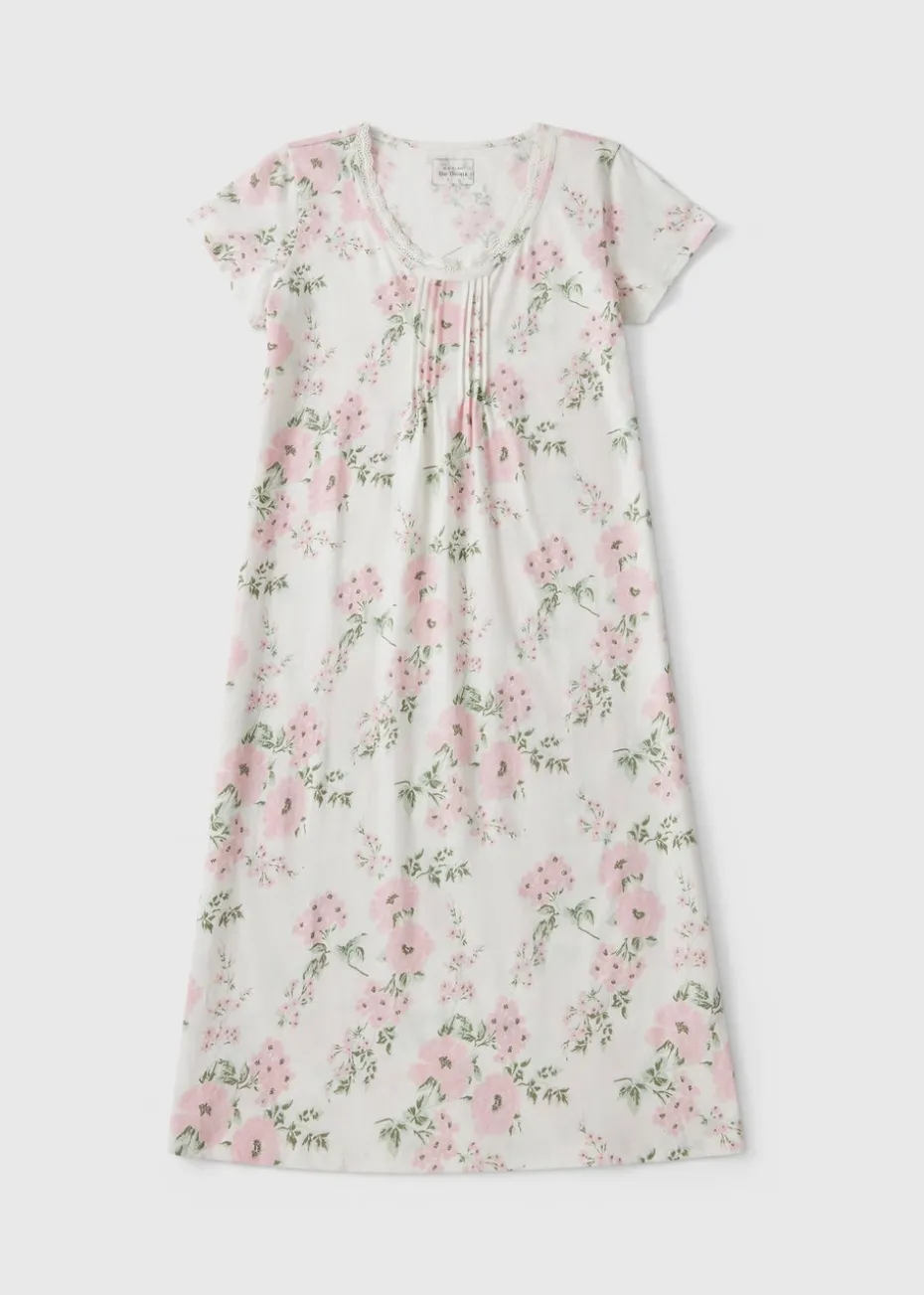 Designed to envelop you in softness, this nightie is crafted from 100% cotton, promising supreme comfort all night long. The delicate floral print in a soothing cream and pink hue exudes charm and elegance, making it perfect for those who cherish classic styles.